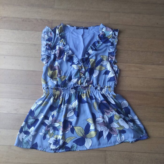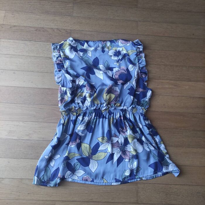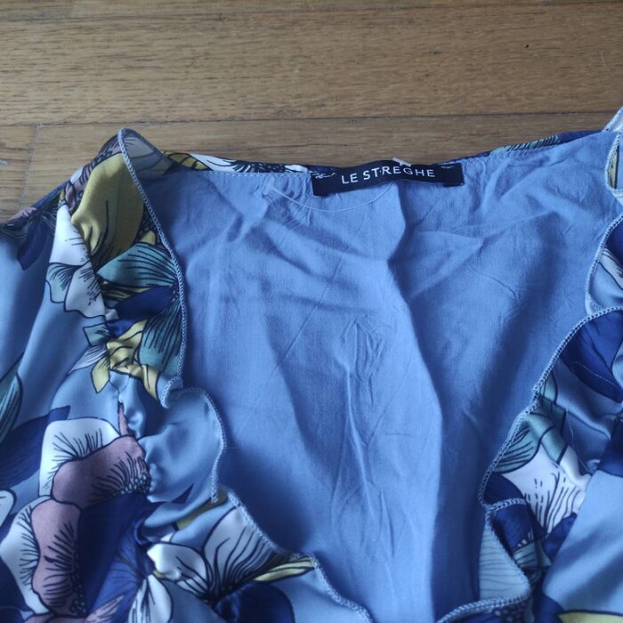 maglietta Le Streghe, taglia m, sintetica, parte superiore doppiata, fantasia azzurra, ai fianchi .