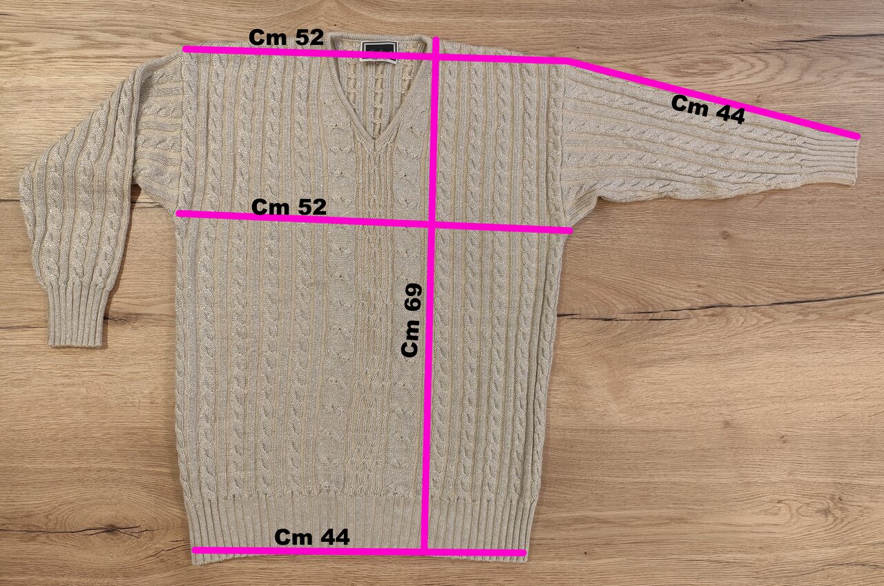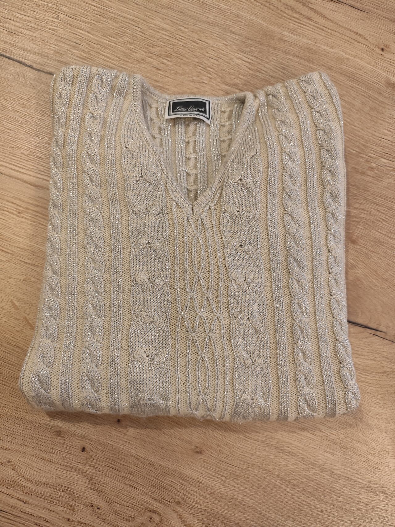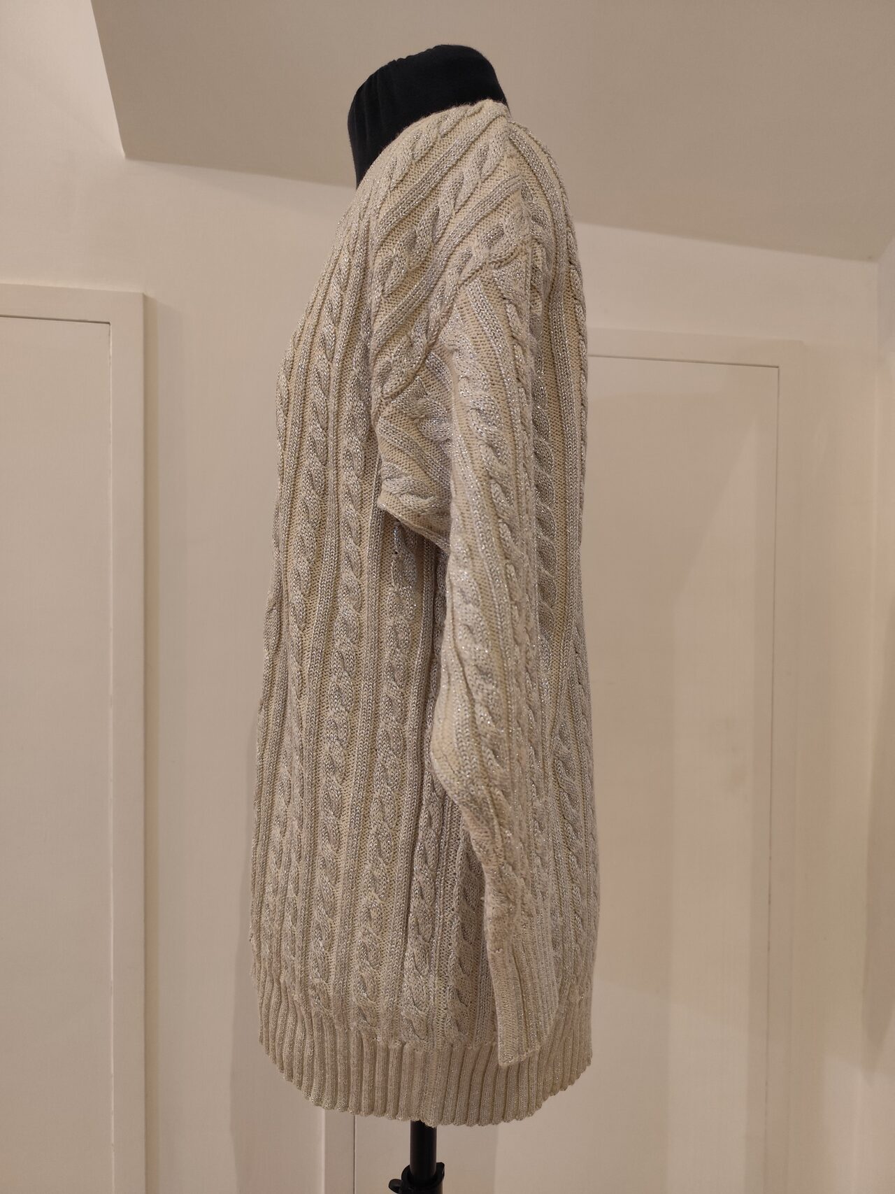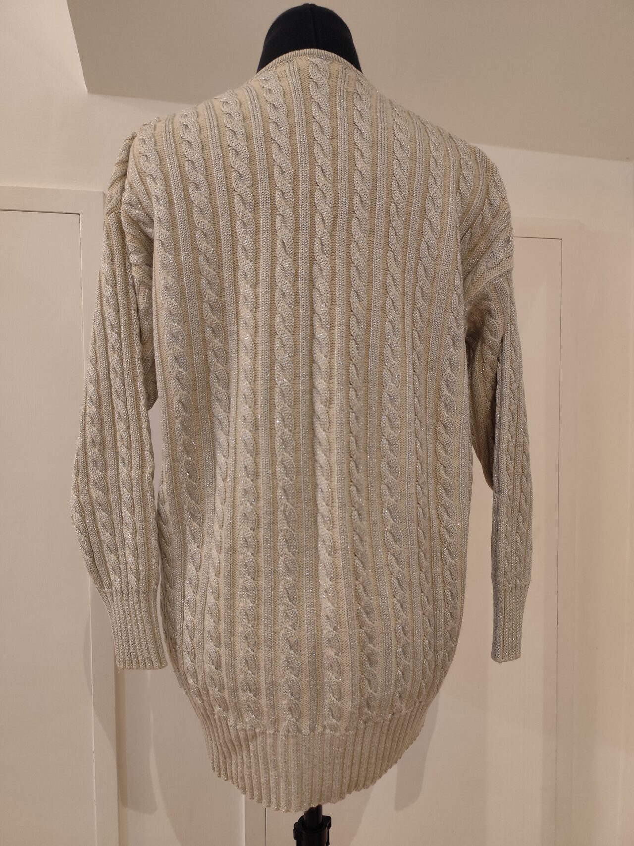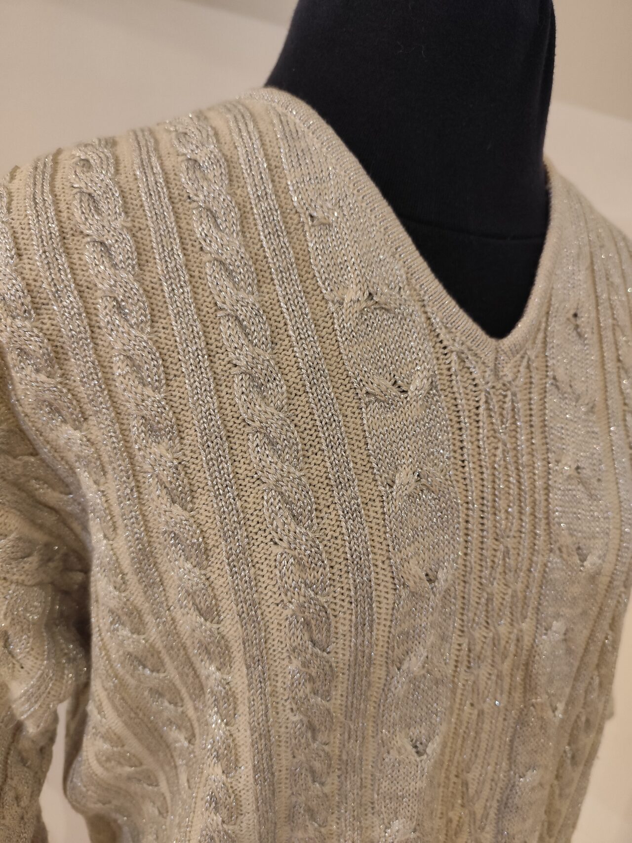Maglioncino Luisa Spagnoli con scollo a V e decorazione intrecciata sul davanti. Molto bello e morbido, in colore panna e argentato, un po’ lungo e con giromanica ampia. Di ottima qualità, made in Italy, in perfetto stato senza difetti.
