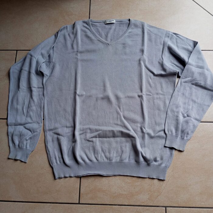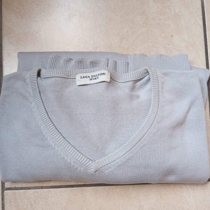 Maglione a V 100 %cotonecolore grigio chiarissimodiventato grande per mio marito,non ha strappi o difetti evidentiVeste una L .