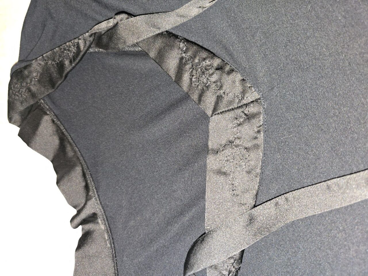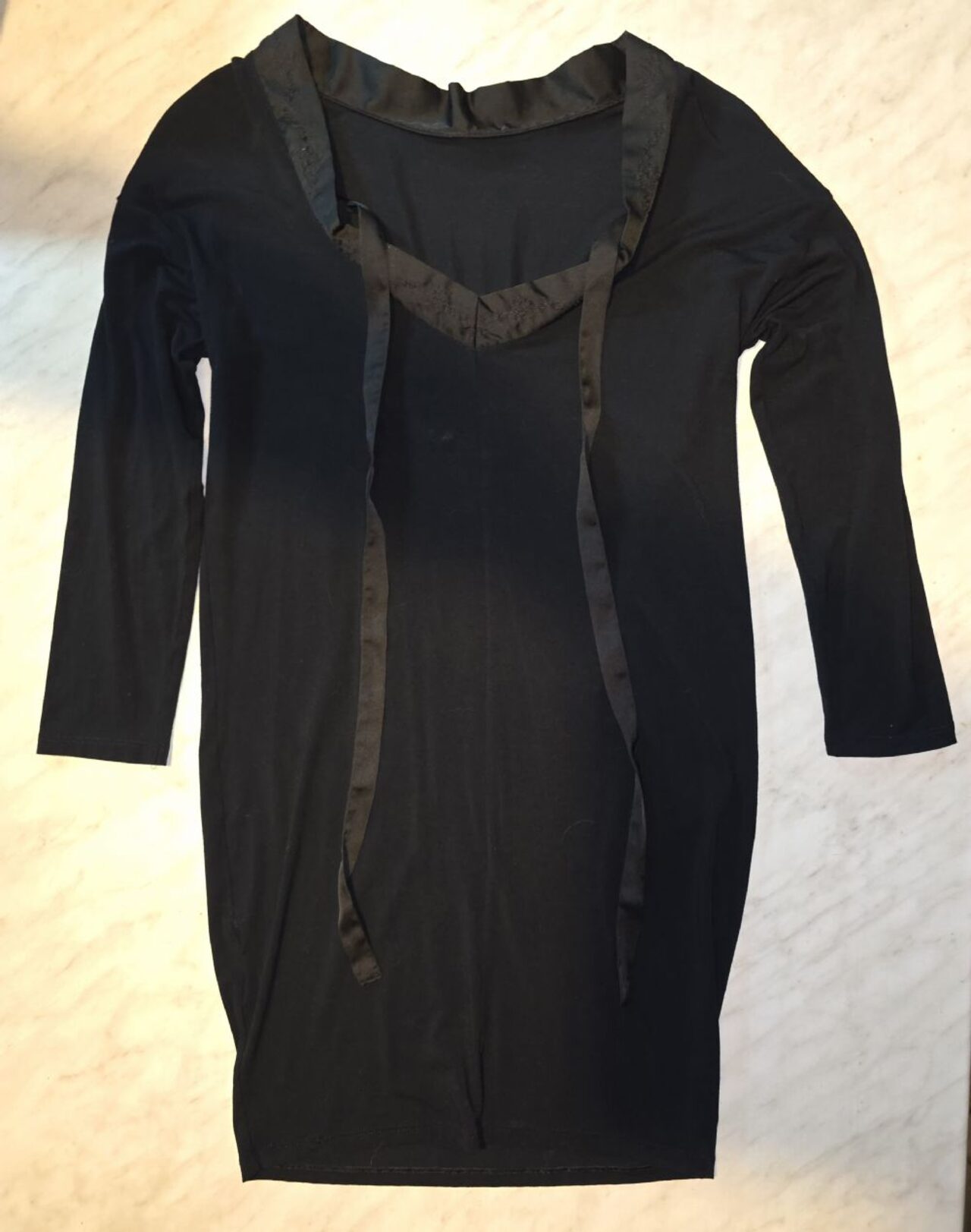 Maxi maglia / Abito nero in jersey elasticizzato taglia S/M, maniche tre quarti. Ascella ascella 42/43 cm, scollo a V bordato di raso ricamato. Lunghezza 83 cm Ideale con pantaloni, panta, gonna. .