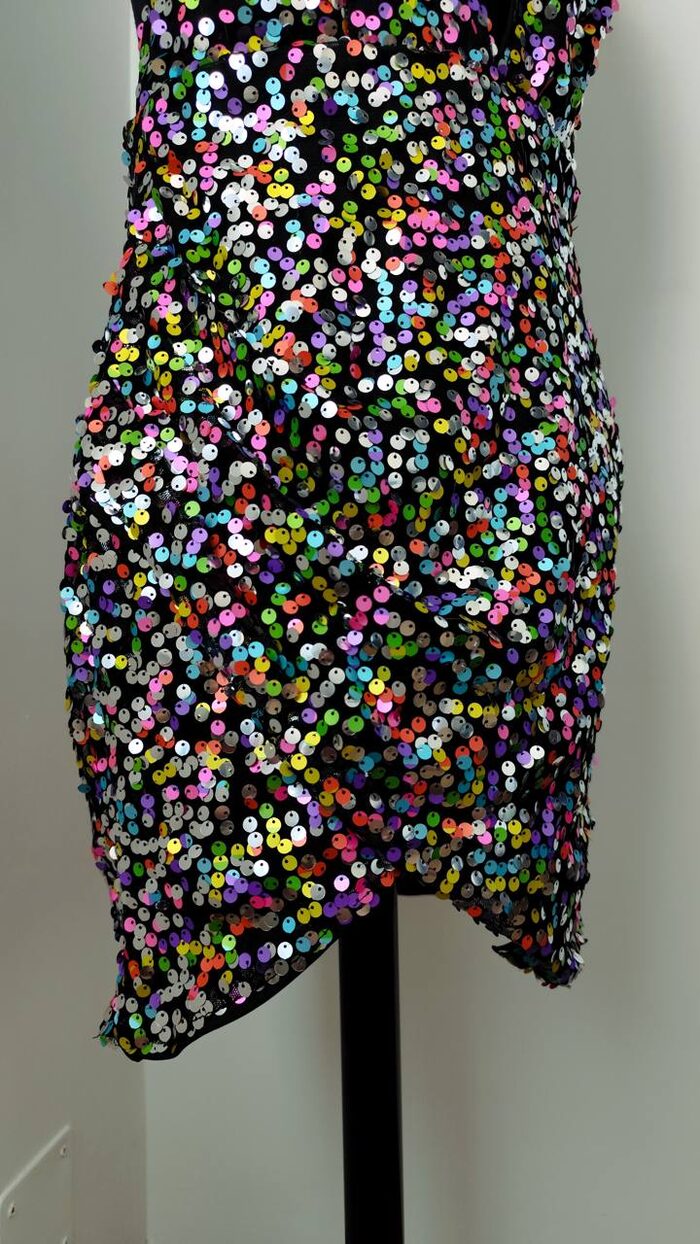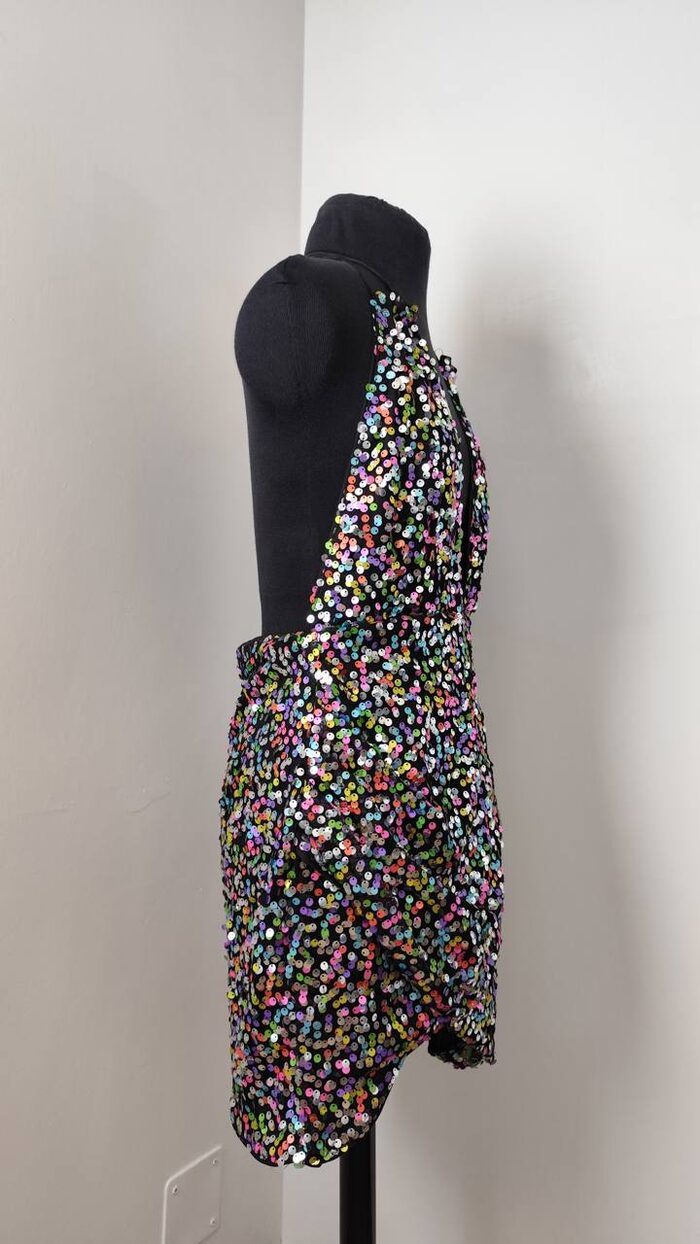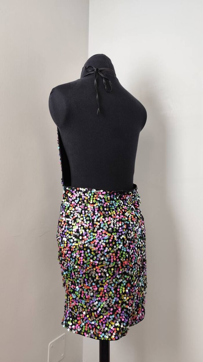 Mini abito molto particolare, in tessuto nero e tulle ricamato con paillette colorate. Modello con gonna corta a portafoglio con pieghe e fondo arrotondato; top scollato con due fasce che coprono il seno e schiena scoperta. In ottime condizioni, non ha difetti.