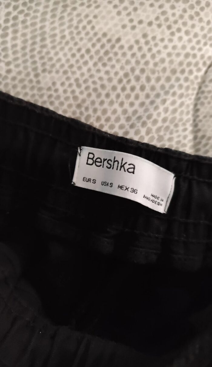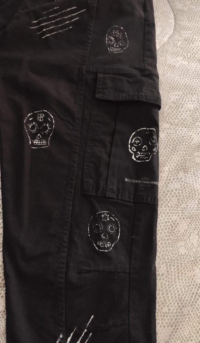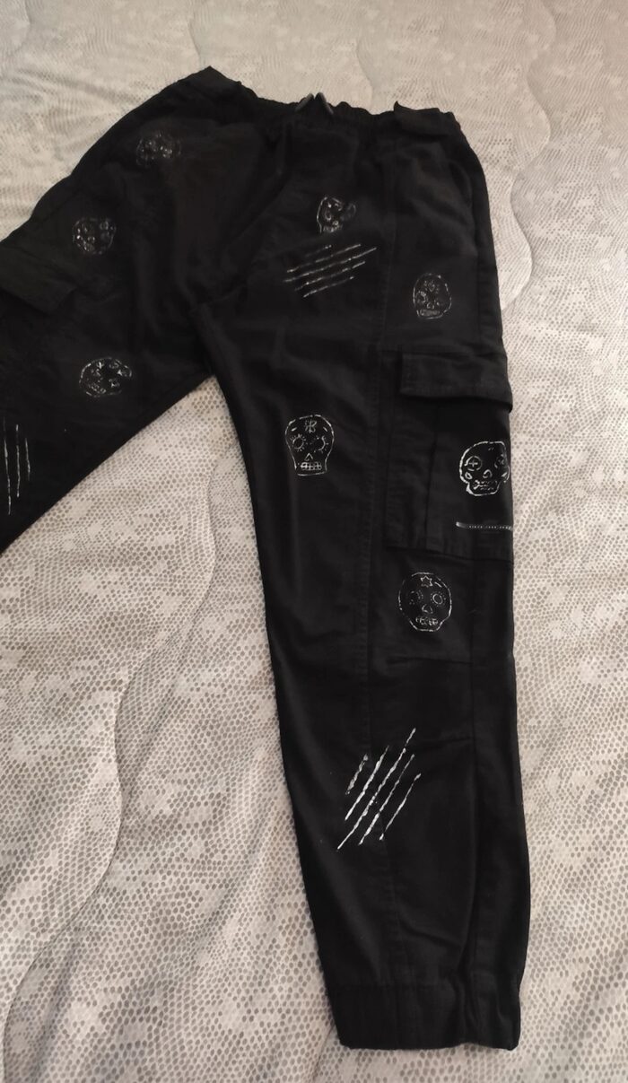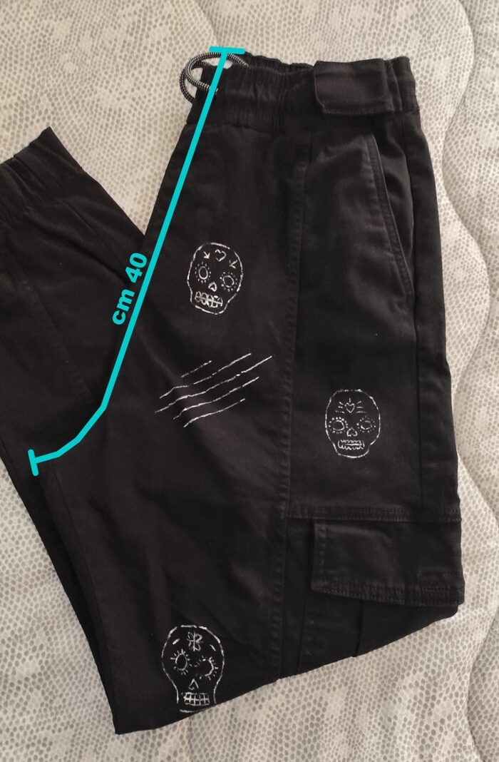 Pantalone cargo nero Bershka, modello stretto con cavallo basso, elastico in vita con possibilità di stringere e diverse tasche. Decorazione realizzata a mano, teschi messicani decorati. Stile dinamico, street e sportivo. In ottime condizioni come da foto.
