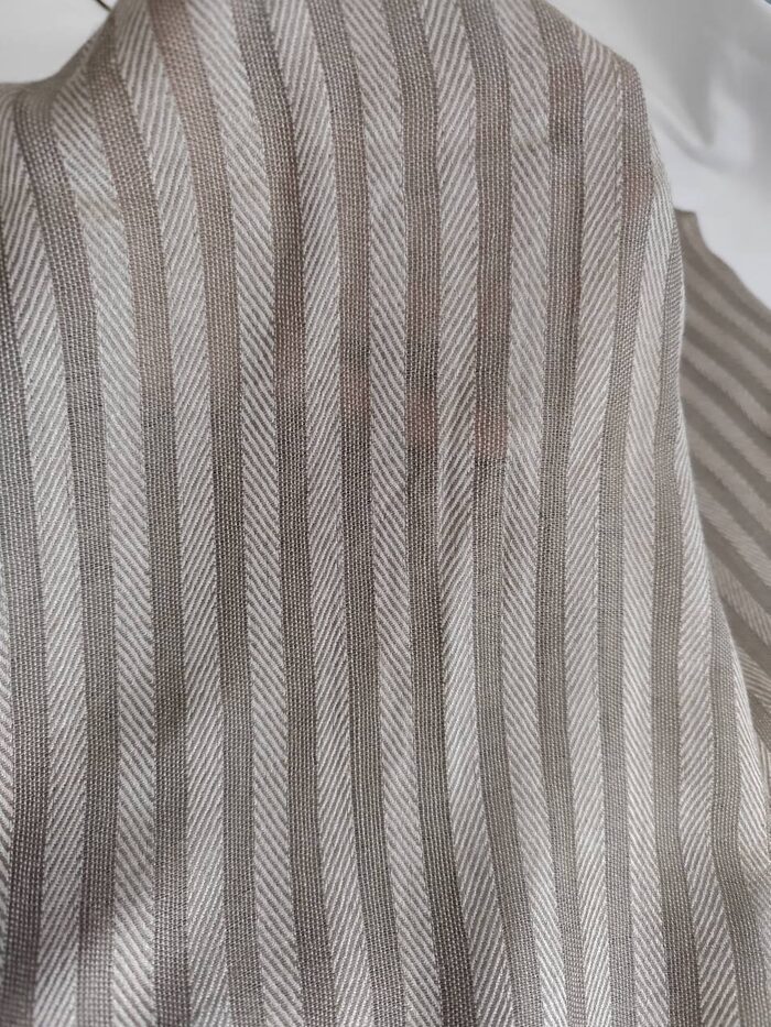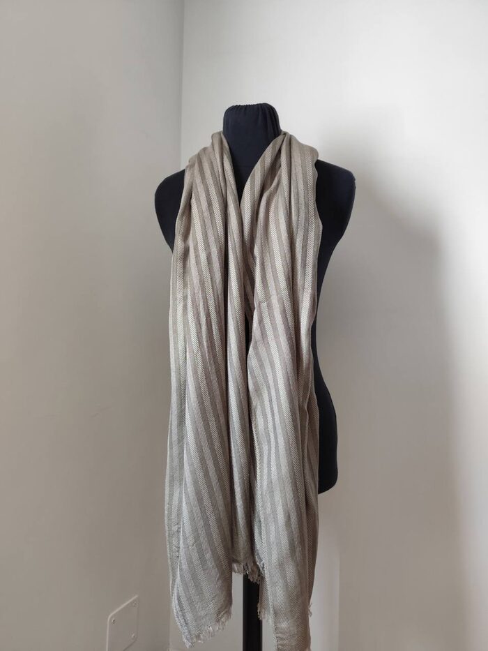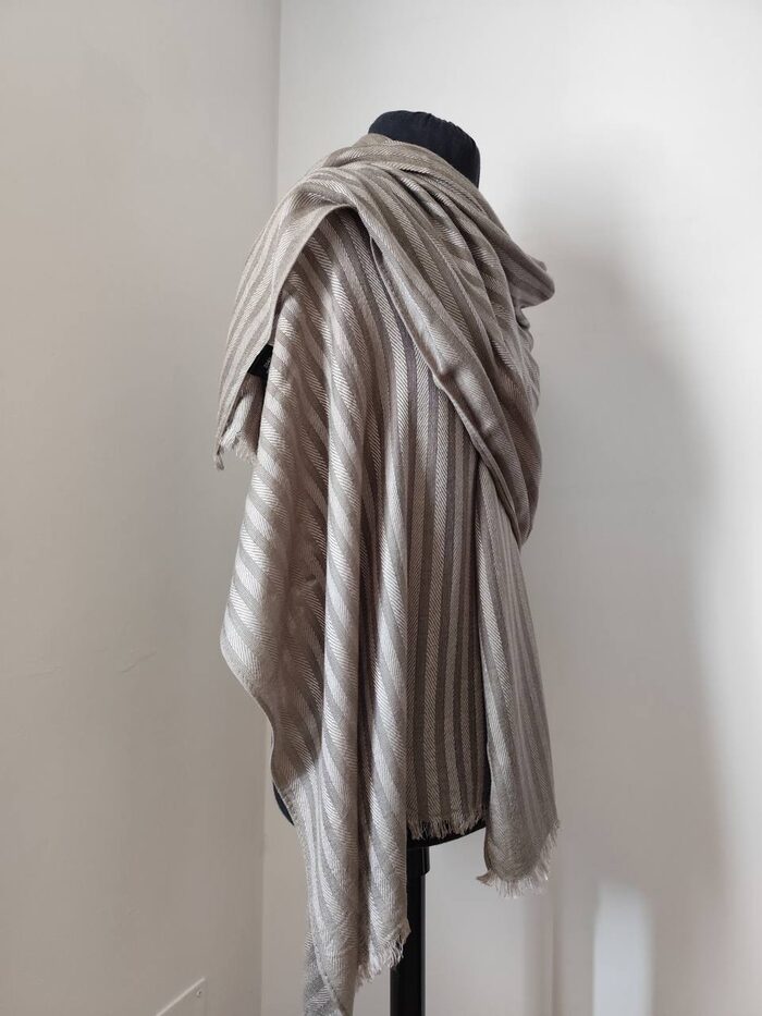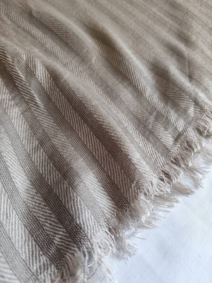 Pashmina scialle in tessuto leggero 100% viscosa color marrone e nocciola. Tessuto fresco con fantasia a righe verticali e lavorazione drill, frangia corta decorativa, da indossare in vari modi, è in perfetto stato, senza difetti.