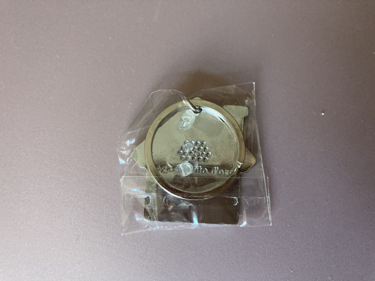 Ancora sigillato. Acciaio lucido. Non è colorato: nella foto riflette i colori intorno.4 x 4 cm circa. .