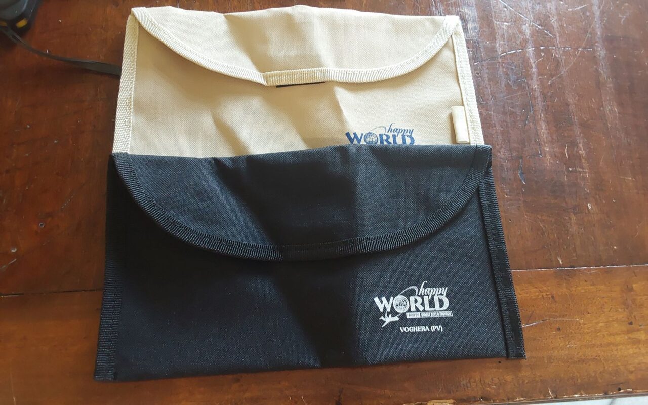 Portadocumenti da viaggio, agenzia happy world, in stoffa. Misure 27x15. 5 crediti l''uno. .