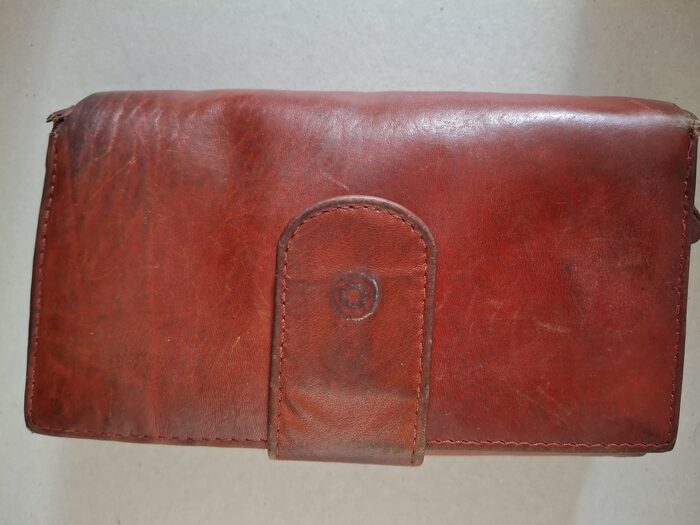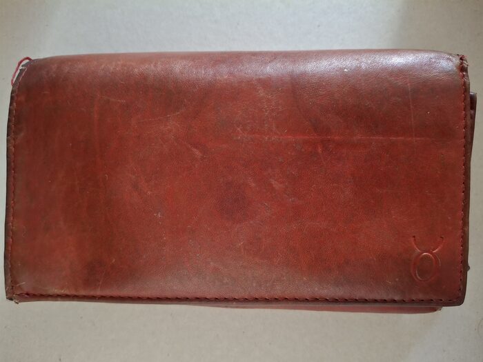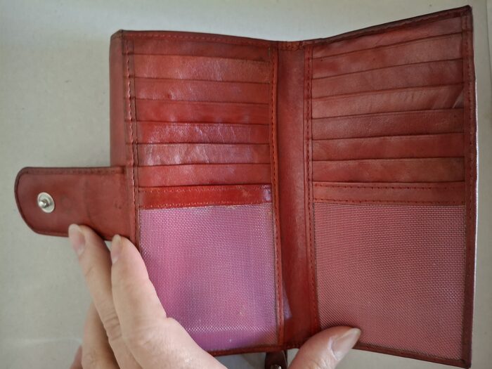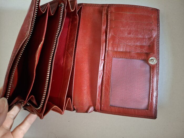 Portafogli in buone condizioni interne ma la pelle che un tempo era rossa è diventato macchiata nel tempo .
