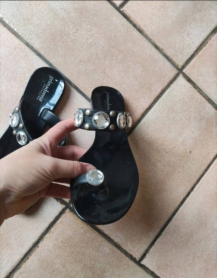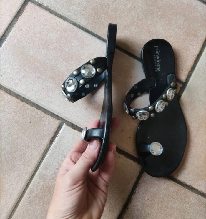 Usato pochissimo, suola e fondo in gomma, nere lucide infradito con dettaglio gioiello. .
