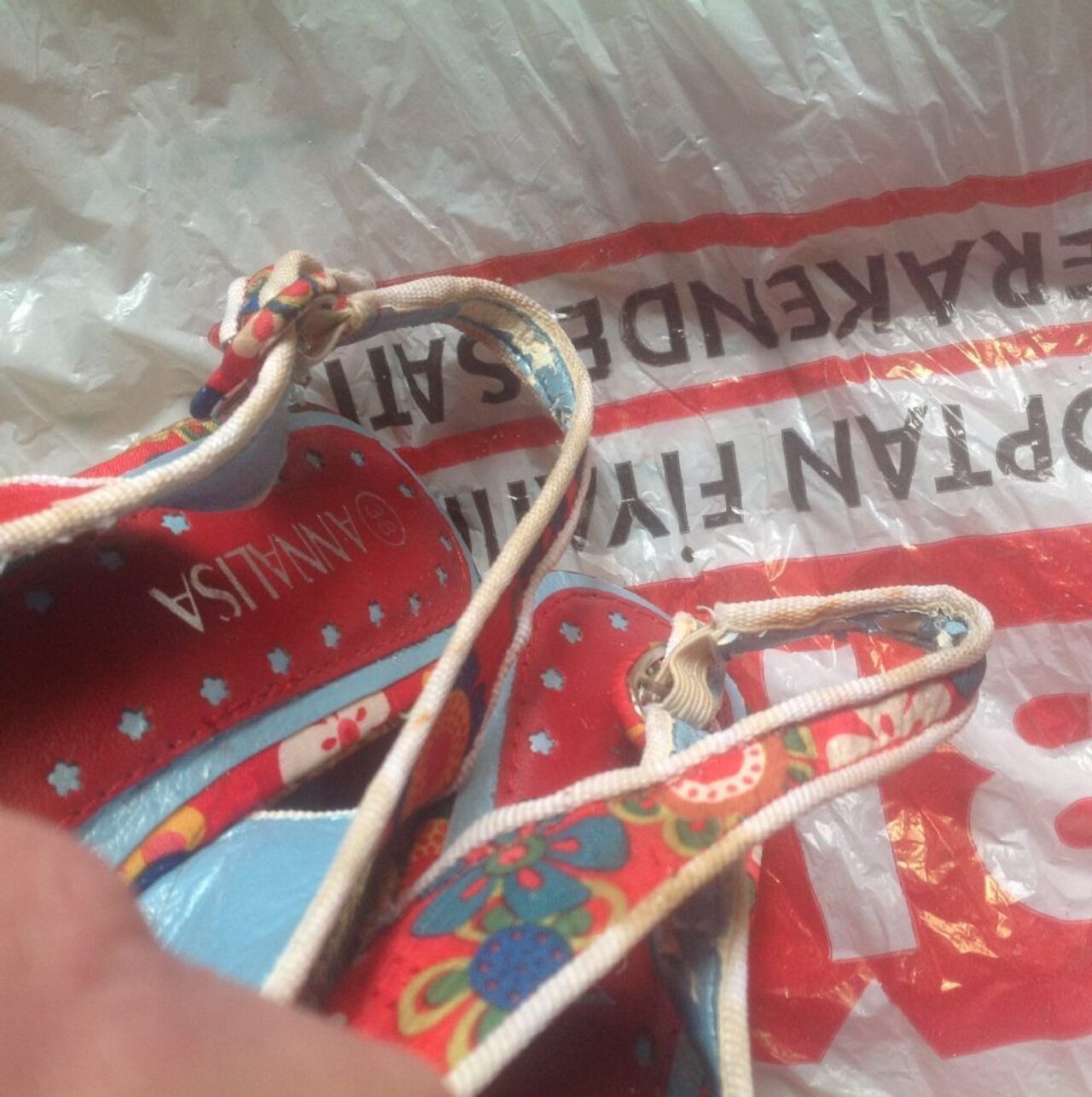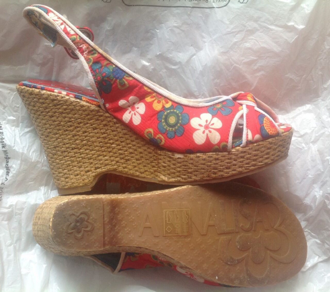 Zeppe open toe molto carine, prese in scambio su ZR ma mai messe. Condizioni strane: dalla suola si direbbero nuove, c''è persino l''adesivo, ma devono essere state provate più volte, perché i cinturini sono "spellati" internamente (il che non si vede e non compromette nulla) e un po'' macchiati (da provare a smacchiare), il tutto in foto 5. Segnalo anche che nel frattempo la tela della tomaia si è un po'' incartapecorita (non era così quando mi sono arrivate), ma penso che questo andrà a posto semplicemente portandole. .