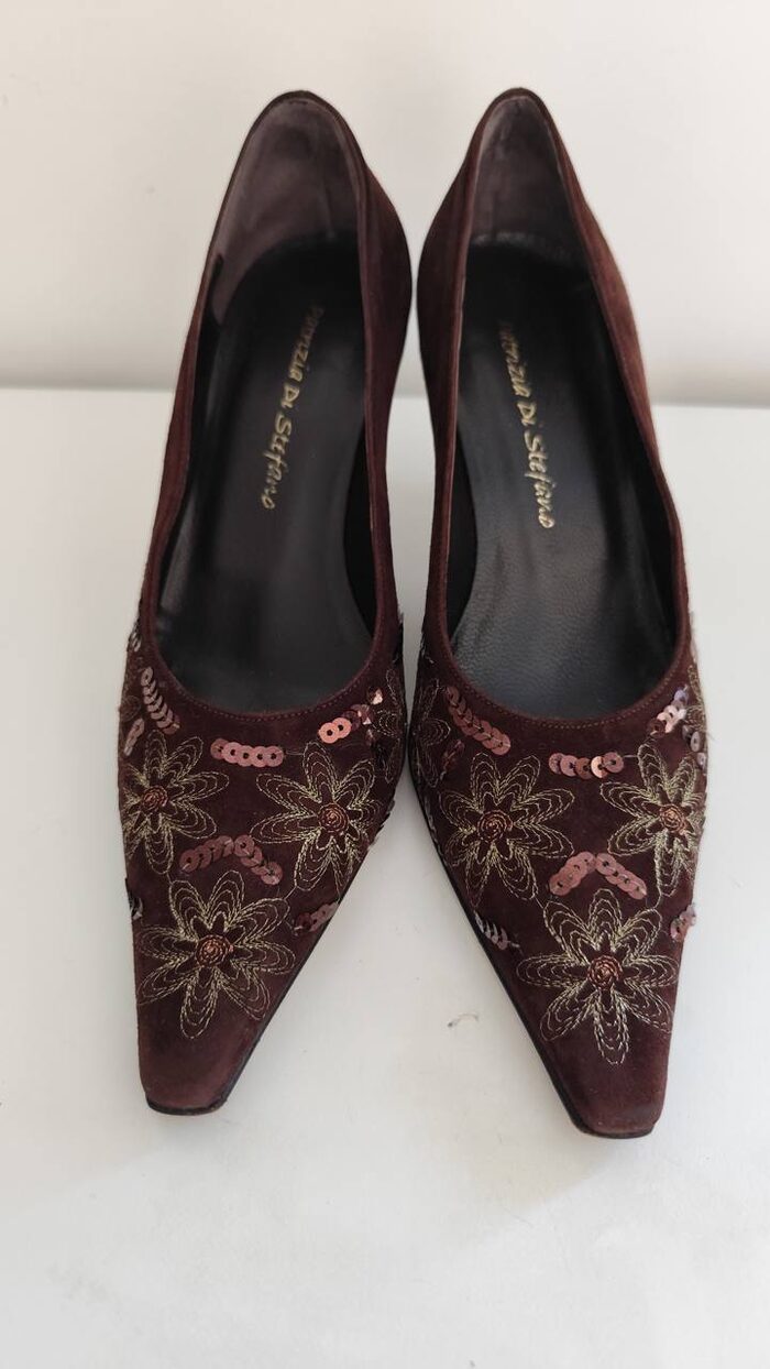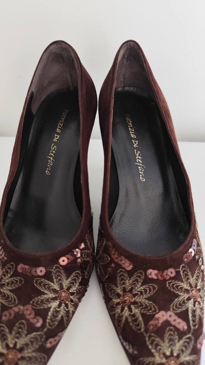 Scarpe marroni eleganti da donna in pelle scamosciata e cuoio, made in Italy. Modello con tacco basso, punta lunga e decorazioni luminose create con ricami floreali dorati e paillettes, uniche e vintage. In ottime condizioni come si vede in foto.