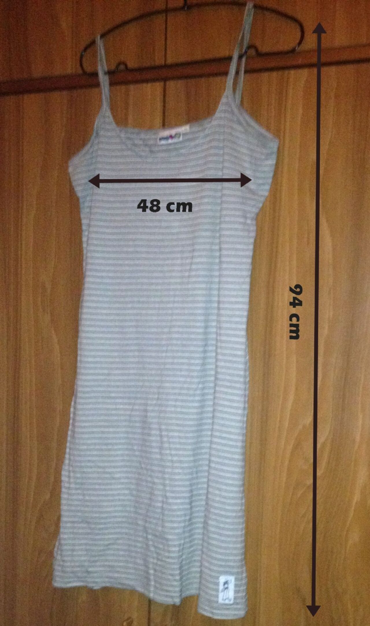 Vestito in cotone a righine nei toni del grigio e blu. Modello a canottiera con bordino in pizzo, segnato XL ma trovate le misure in foto. Mai indossatoDa 10 a 7 crediti fino alla prossima collettiva .