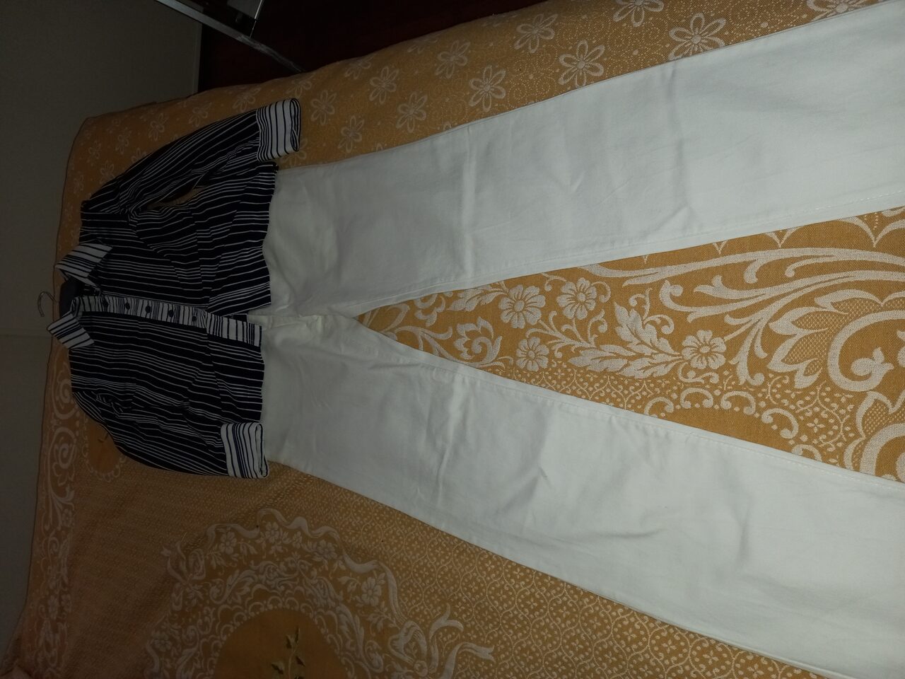 Camicetta maniche lunghe in poliestere, jeans bianchi a sigaretta on cotone leggermente elasticizzato,tg 38,ma secondo me possono andare bene anche a un 40. Misure su richiesta. In ottime condizioni .