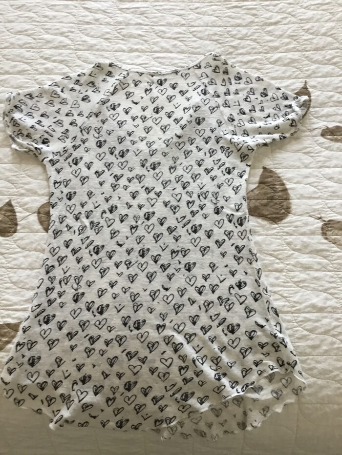 T-shirt bianca Zara con tanti cuoricini neri, fondo stondato e maniche raglan. Tg S e queste le misure: ascelle 38, lunghezza max 67.