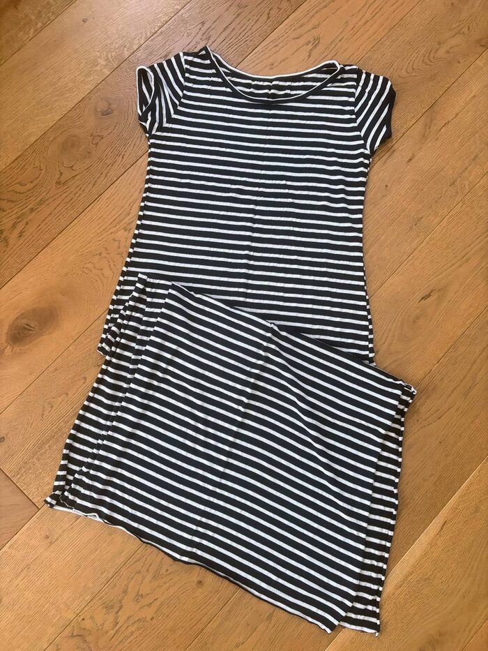 Non so più la composizione né la marca perché ho tagliato i cartellini ma è molto bello a righe blu e bianco.