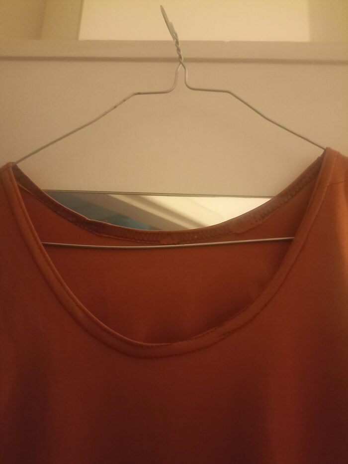 Vestito lungo tipo canotta, arancione, veste M/L, lunghezza 100 con spacchetti simmetrici al fondo di 20 cm, 43cm di ascelle, poliestere .