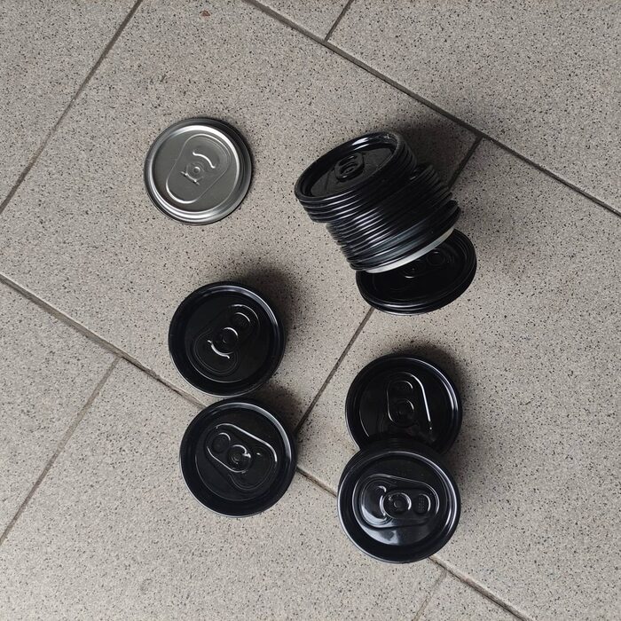 circa 35 coperchi di lattine nuovi. Sono.la.parte superiore delle lattine di alluminio uscito dalla fabbrica (nero su un lato e alluminio dall'altro) .