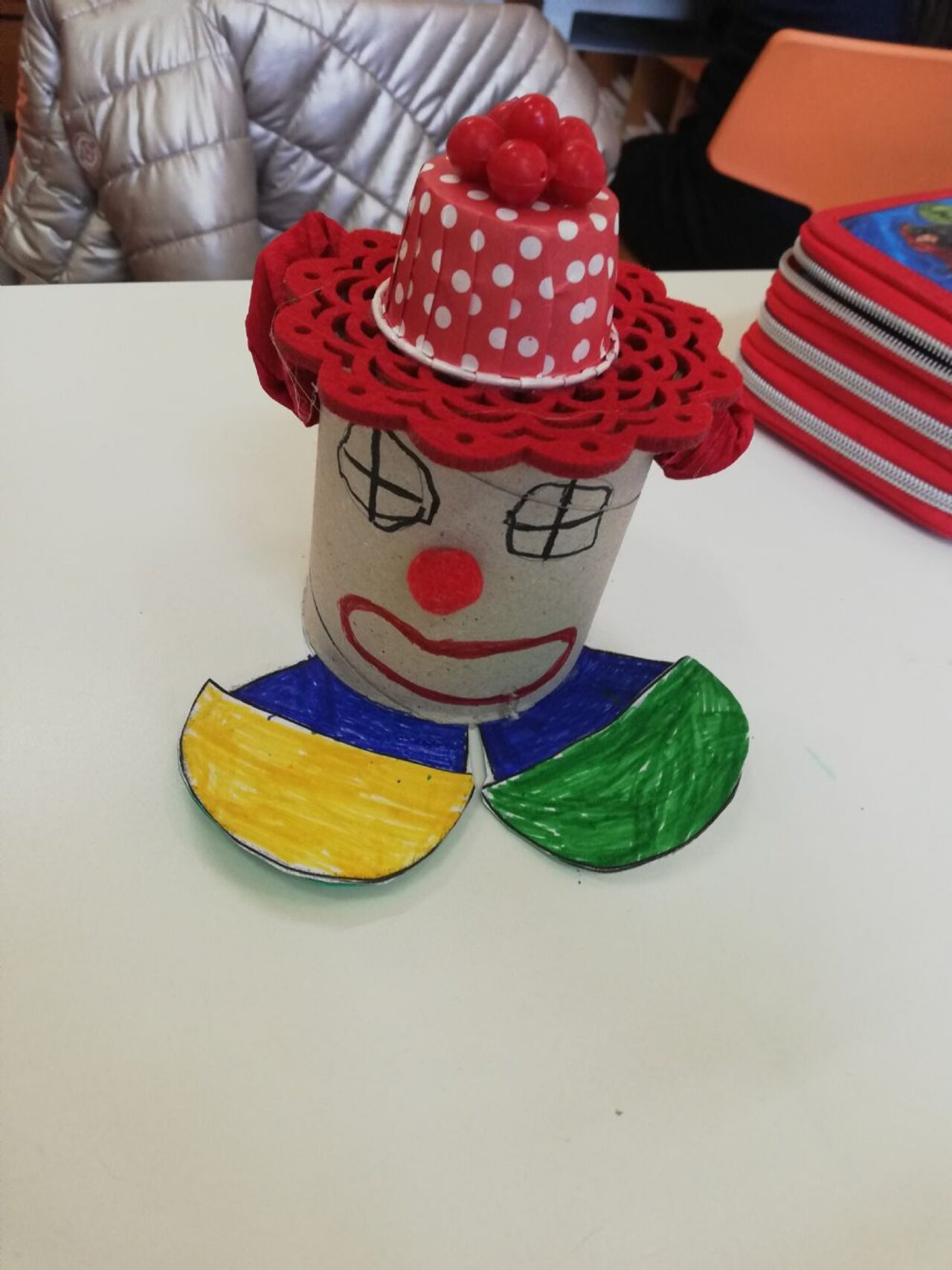 Clown di carnevale realizzato con il tubo di cartone di ValentinaTs, il sottobicchiere in feltro di Sbarasso e il fiore di plastica non ricordo di chi sia.Comunque: GRAZIE! .
