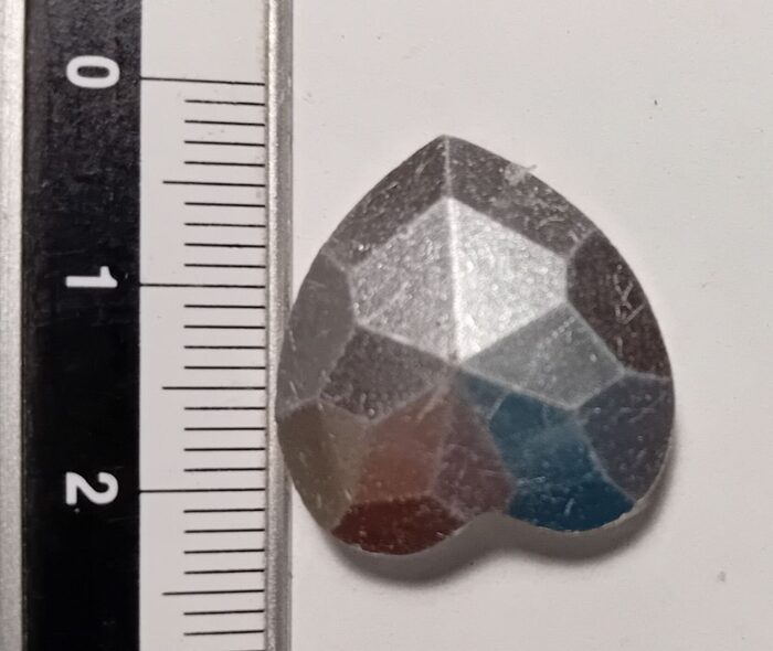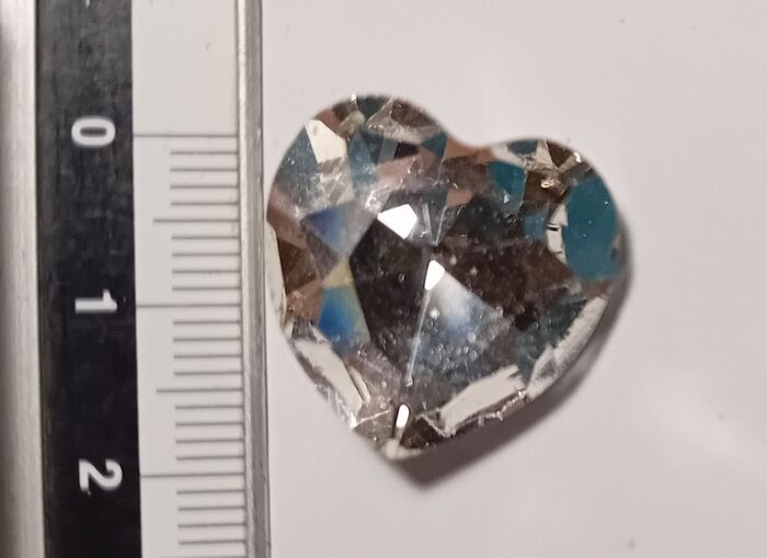 REGALO Strass a forma di cuore, penso sia in vetroIntegro.Il retro (foto 2) presenta qualche graffietto dovuto al contatto con il fondo del cassetto.Non ha nessun foro per infilarvi il filo.Potrebbe essere "montato" in una gabbietta di filo metallico come fosse un diamante.... .