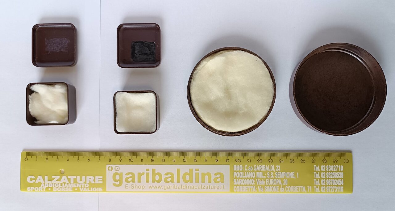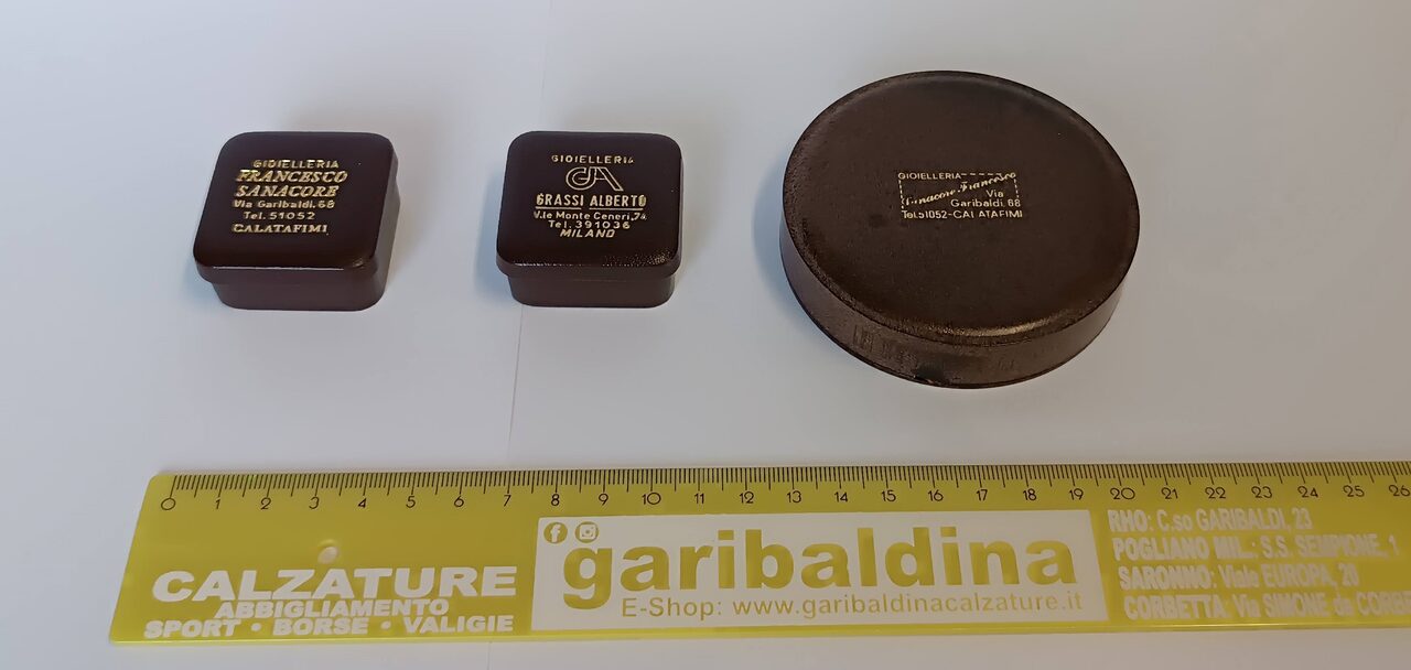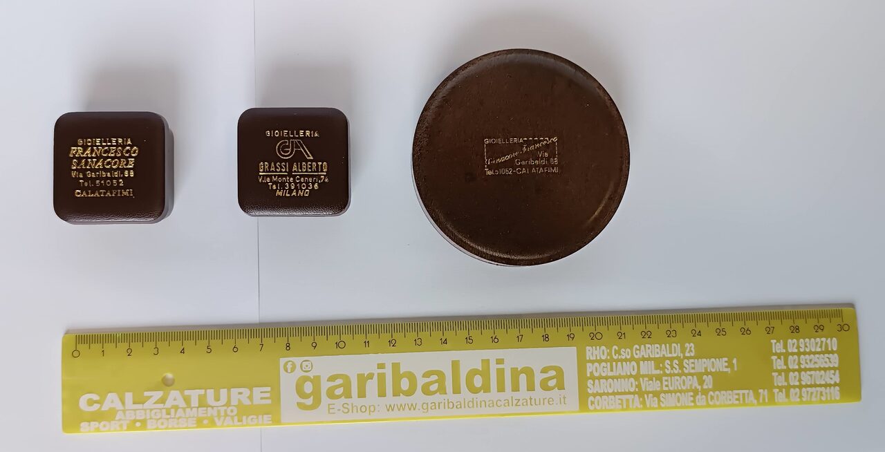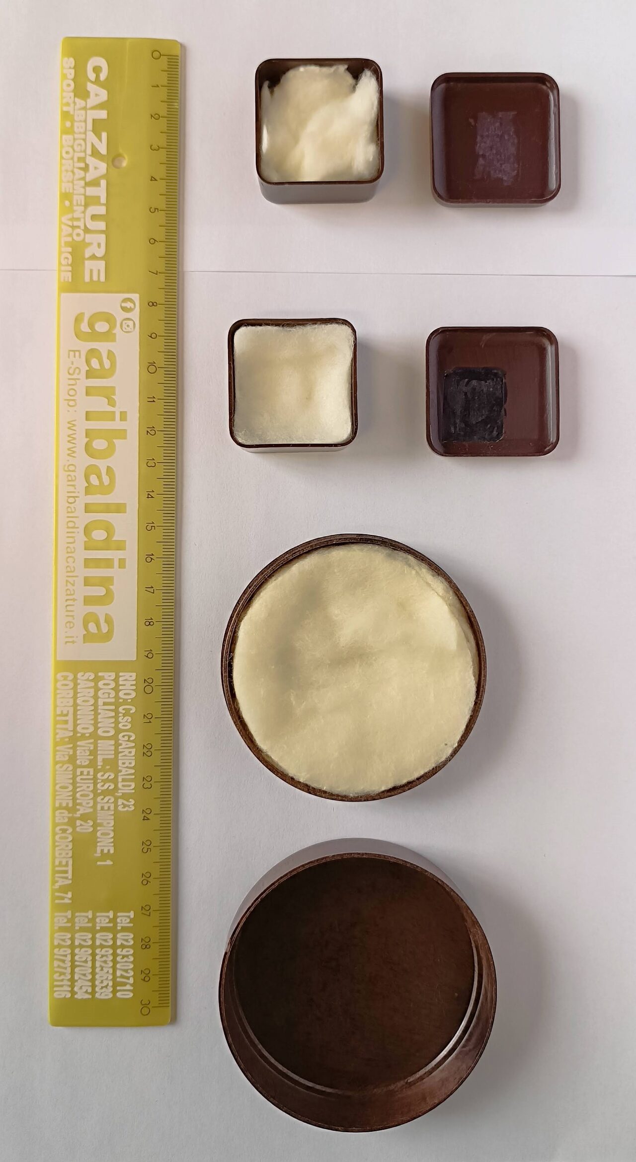 Le quadrate all'interno sul coperchio hanno una un segno di un'etichetta ormai tolta non invadente né con residui e l'altra invece un'etichetta oscurata col pennarello, vedi foto nr.3 .