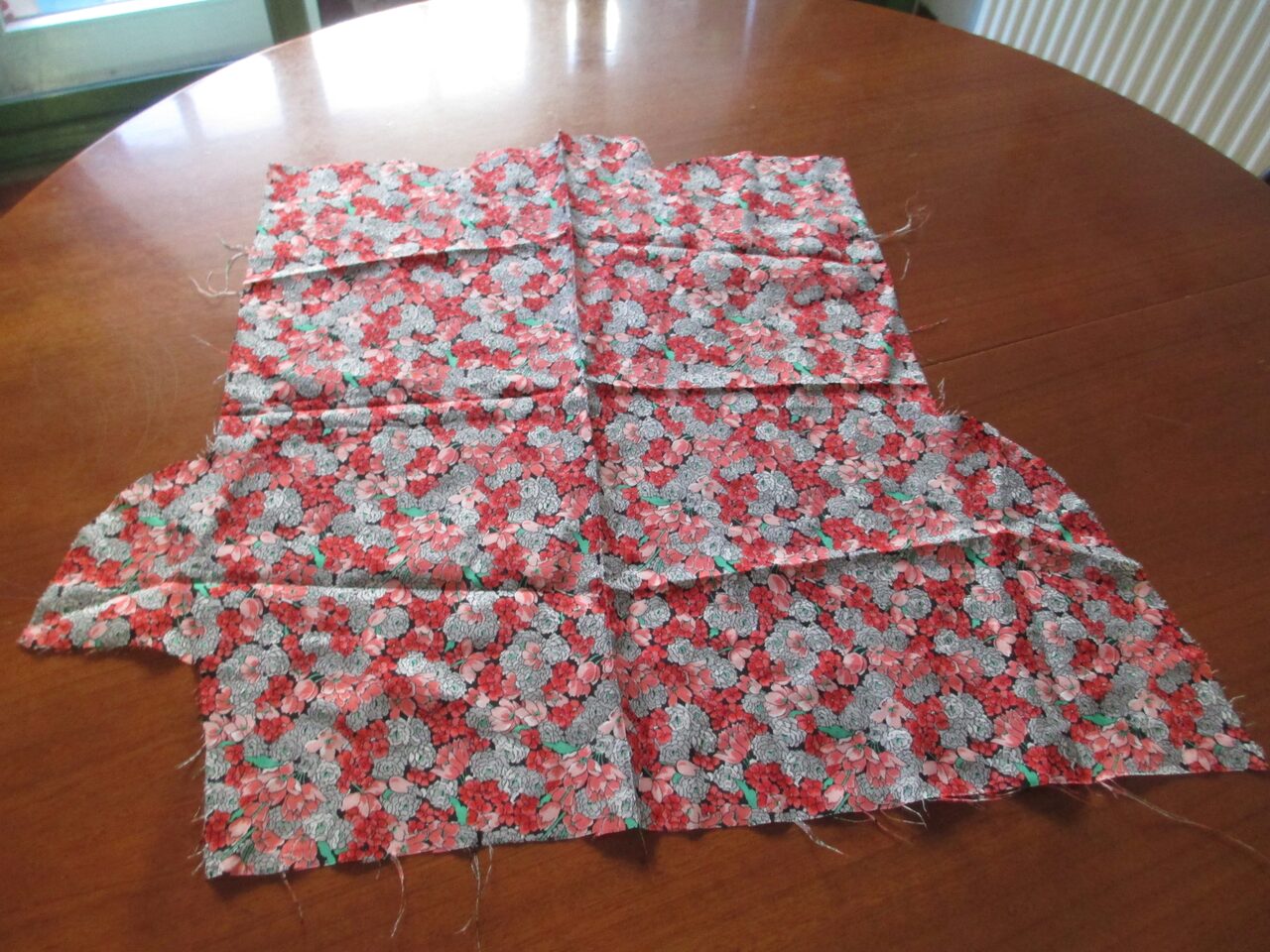 Stoffa a tema fiori rossi.Materiale sintetico; non so che tipo, ma sembra viscosa.Misure approssimative: 45x55cm .