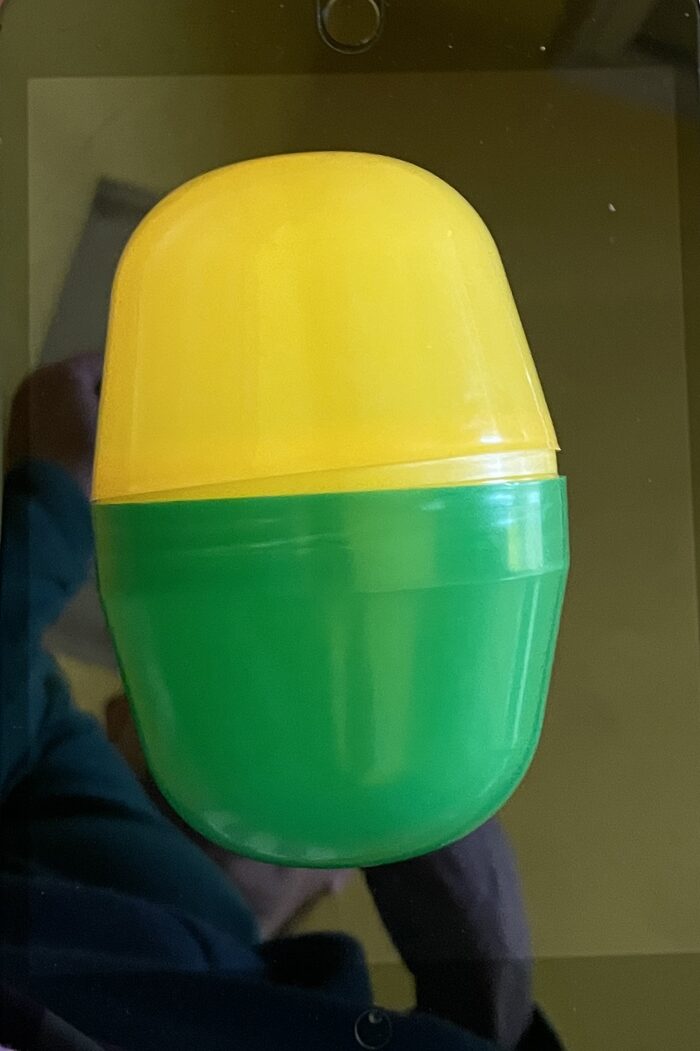 Uovo di plastica, interno di uovo di pasqua, per chi lo cercava, lo regalo. Circa 10 cm di altezza. .