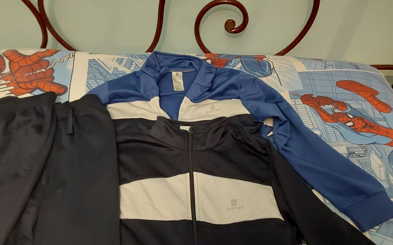 2 tute Domyos una azzurra e una nera, in poliestere, le bluse sono intatte mentre i calzoni sono un po segnati sulle ginocchia come da foto. Sono da battaglia ancora sfruttabili. .
