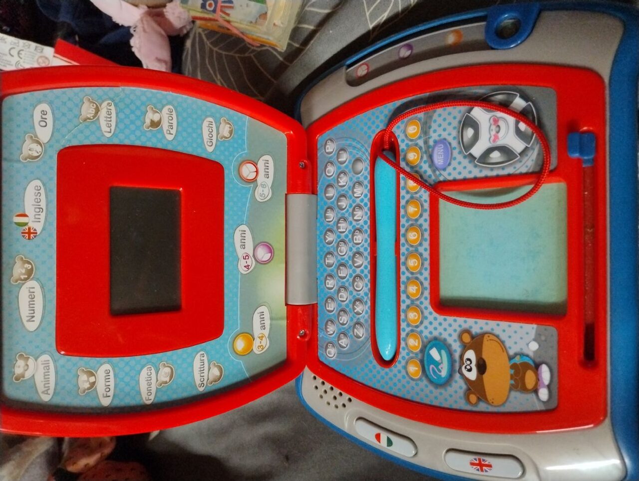 Dai 3 ai 6 anniNon funziona più la parte bassa dove si scrive con la penna per il resto è ok.Funziona con tre pile stilo AA .