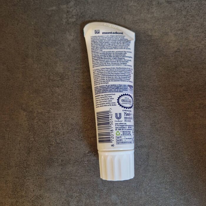 Dentifricio per bambini da 6 anni in su. Solo provato. Aperto il 25.04.26 scadenza 12 mesi. Gusto menta. .