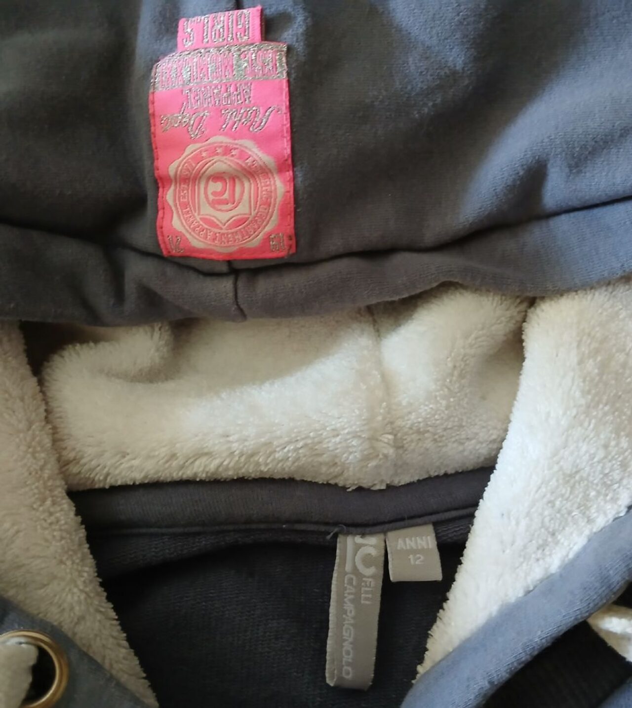 Felpa pari al nuovo, lavata e indossata una sola volta, perché a mia figlia non piaceva. Cotone elasticizzato, cappuccio morbido, taglia 12. Da ascella ad ascella 40 cm, lunghezza presa da dietro 53 cm. .