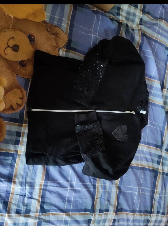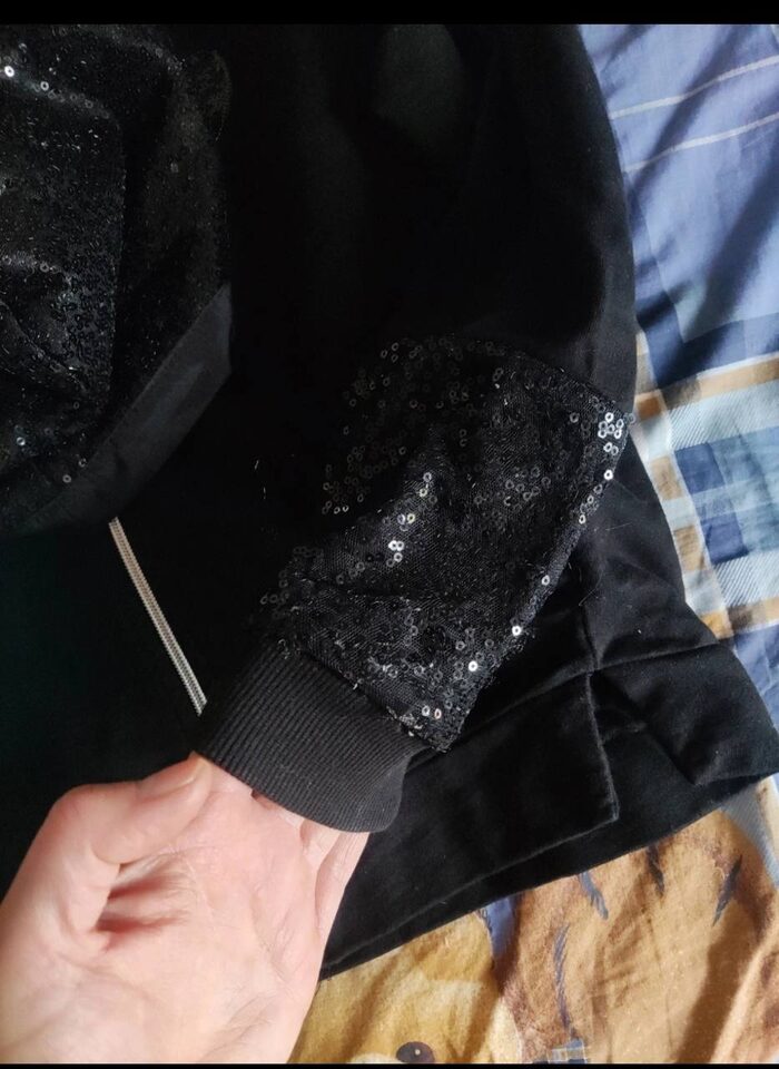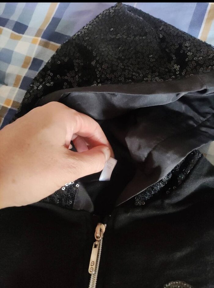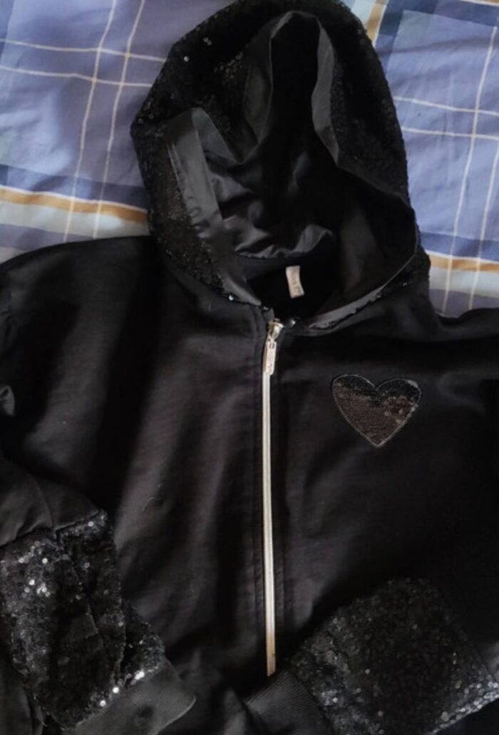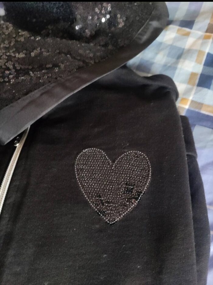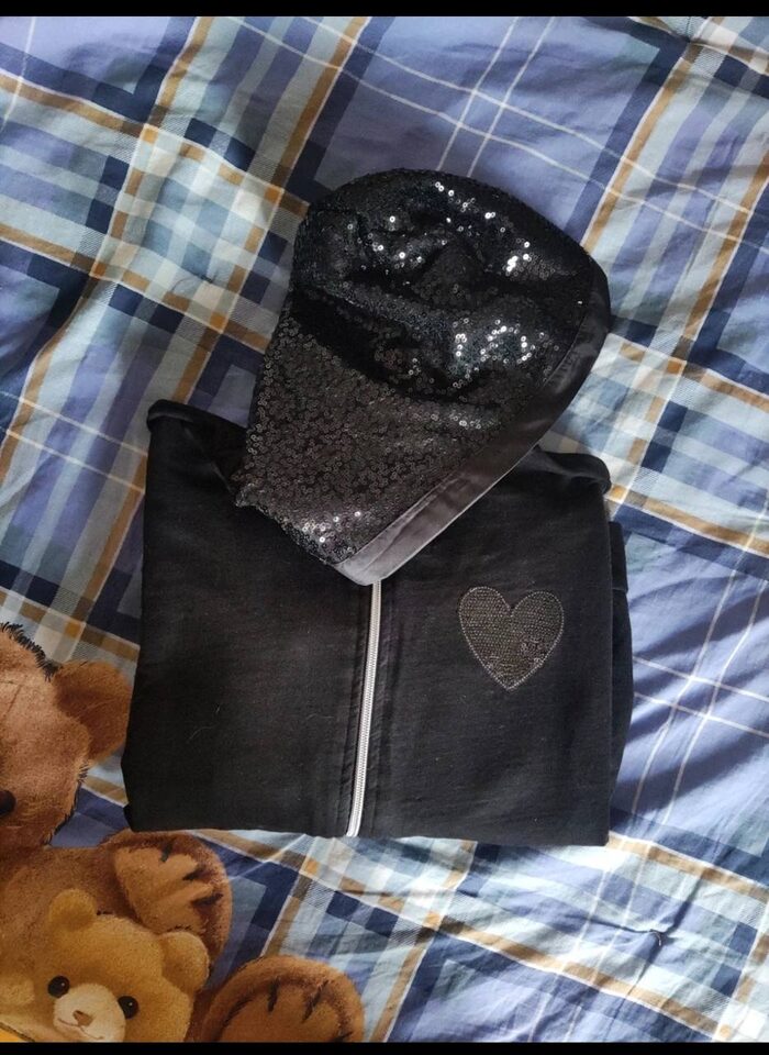 Indossata qualche volta, paillettes sulle maniche ,sul cappuccio e sul dettaglio cuore. Zip frontale con due tasche laterali e spacchetti davanti. Piccolo difetto impercettibile manca qualche paillettes sul bordino della manica sinistra. .
