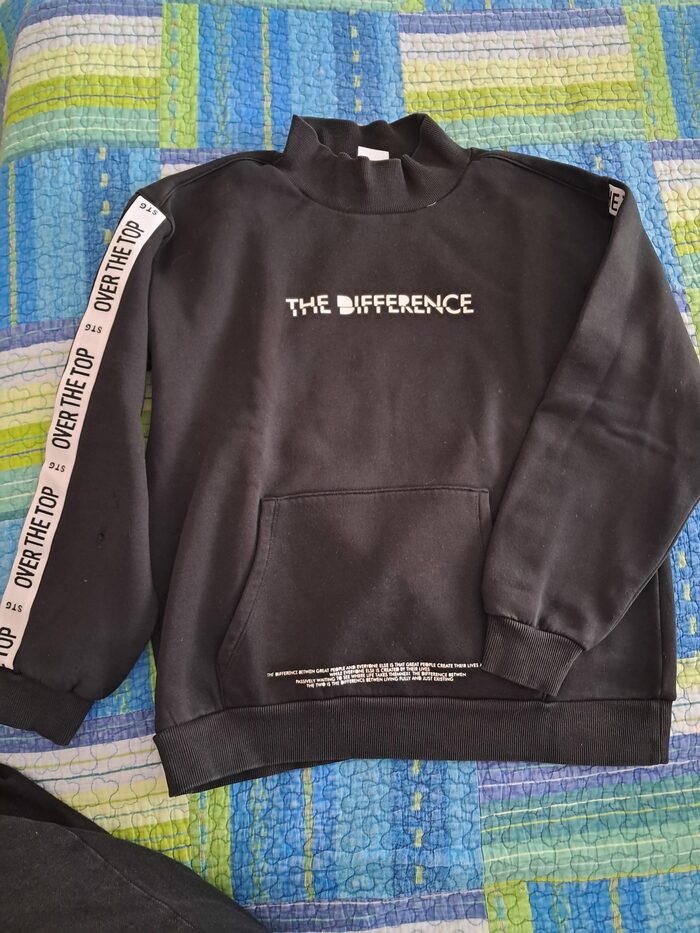 Felpa ragazzo taglia 40, veste 14 anni più o meno. In cotone e poliestere. Ha dei taglietti su una delle maniche,vedi foto .