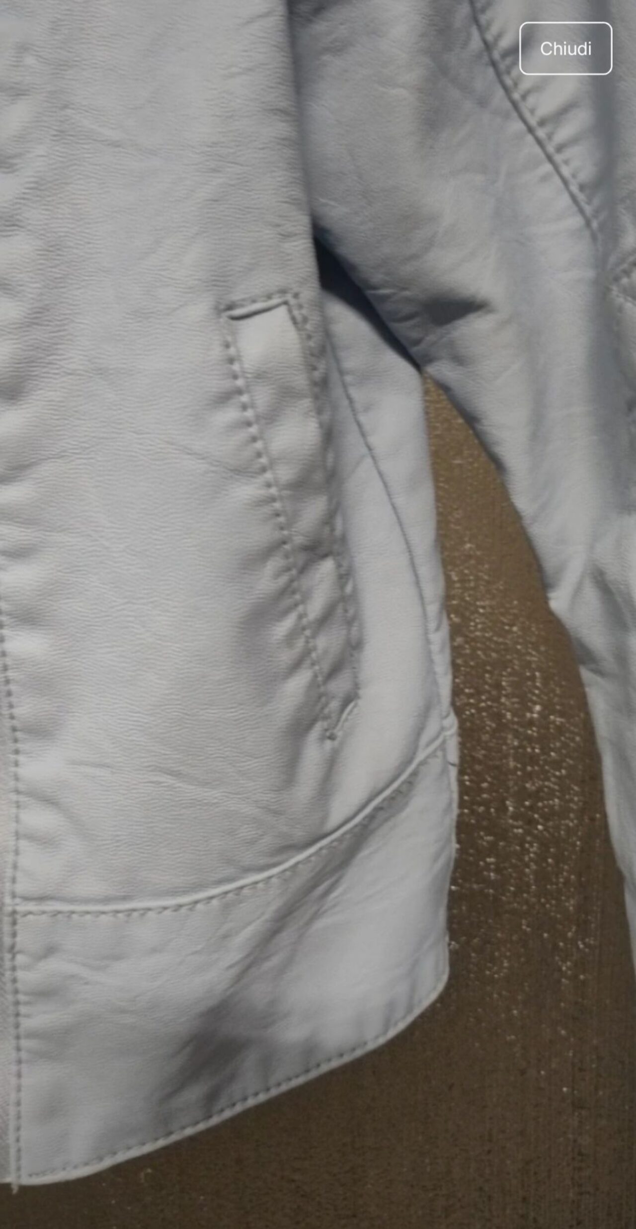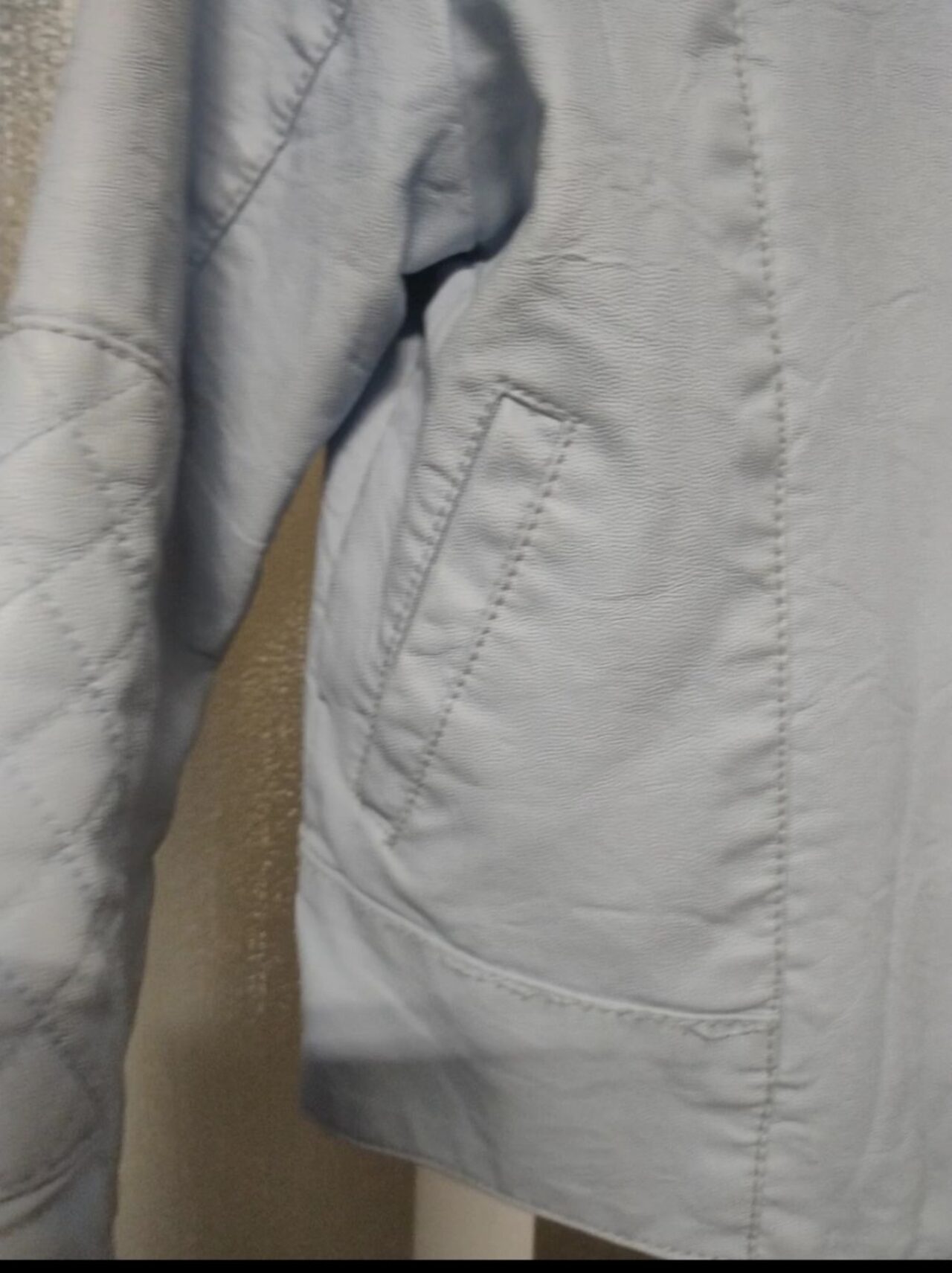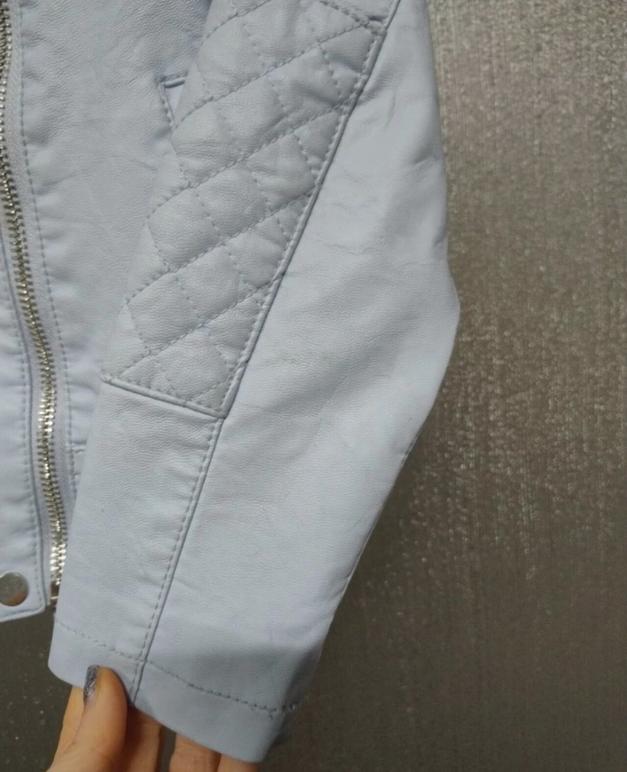 Bellissima ma a mia figlia non va più Qualche imperfezione come da ultime foto ma l'' ecopelle è perfetta Due puntini sulla manica sinistra Due sulla zona del gomito sulla manica a dx e la cucitura leggermente rovinata nella parte sx in basso Come si vede dalle foto però è tutto poco evidente .