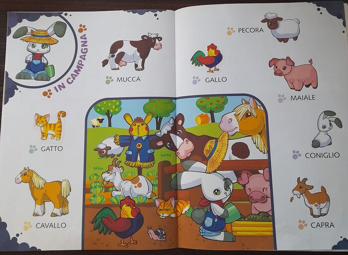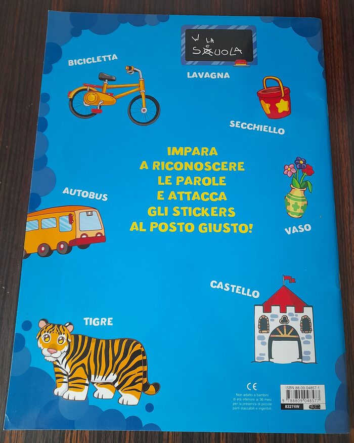 Un librone grande ma leggero, ancora bello anche se gli stickers sono ormai tutti attaccati al loro posto. Giunti Kids. Misure 25x34 cm .