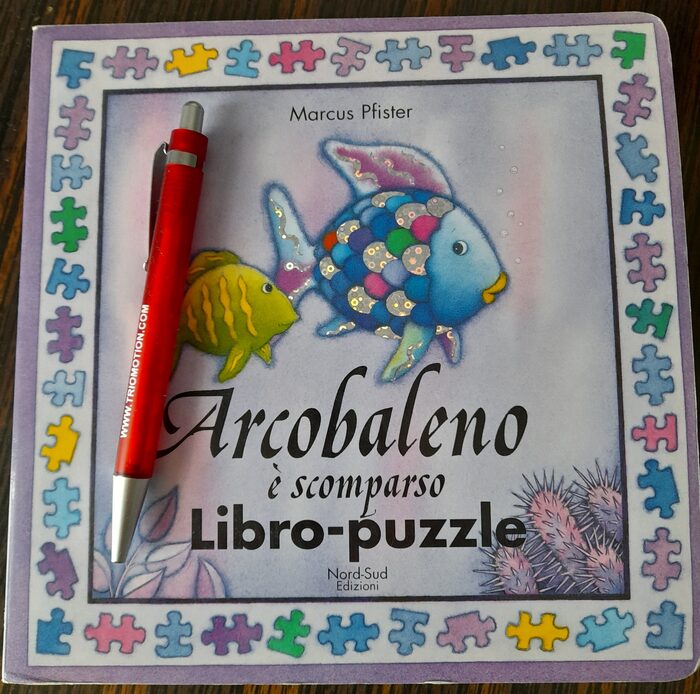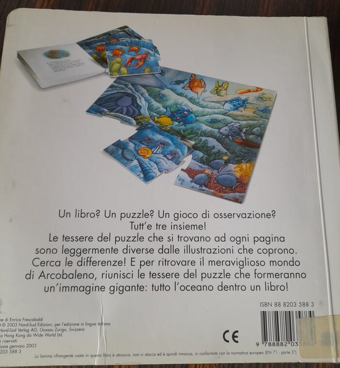 Un libro che parla del mare, pagine spesse e grandi pezzi di un puzzle da ricomporre, un pezzo in ogni pagina. La penna in foto per dare la misura del libro. 16 pagine, cartonato spesso. Misure 20x20x2,5 cm .
