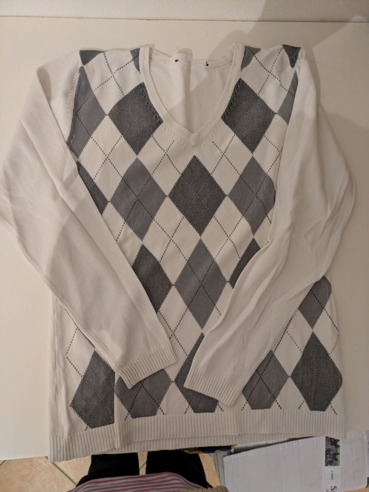Maglioncino bimba tg 12/13 anni, l etichetta non c''è, ma dovrebbe essere questa la taglia. Viscosa, ed elasticizzato, colore bianco a stampa rombi grigio. .