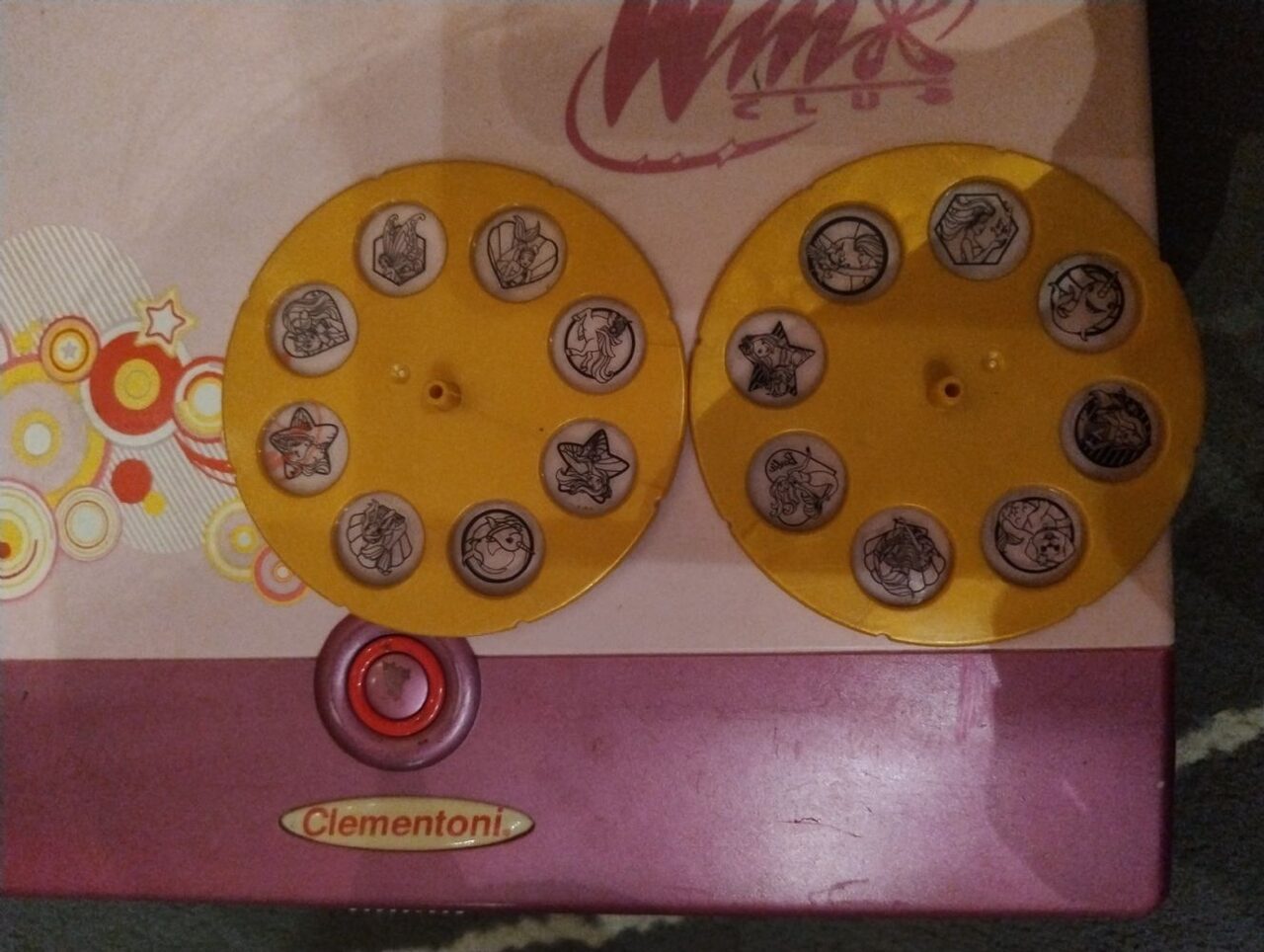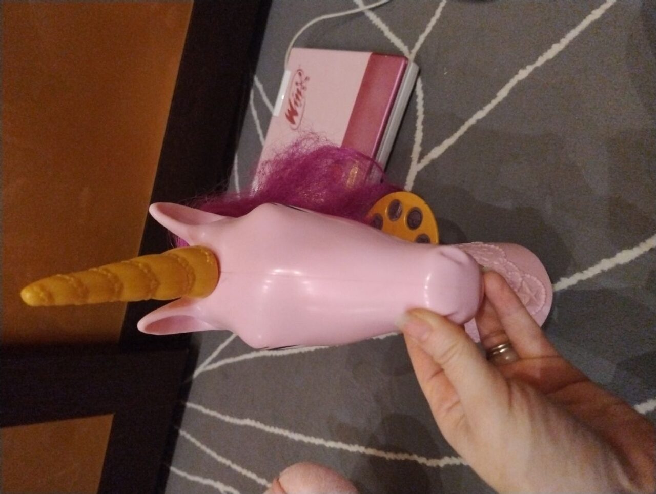 È un unicorno con all'' interno una luce e uno specchietto, si inseriscono dei dischetti e lui proietta il disegno sul foglio, ingrandito così si può tracopiare.Ha due dischetti con 8 disegni ciascunoLa criniera è da spazzolare Nella seconda foto ho messo i due dischetti .