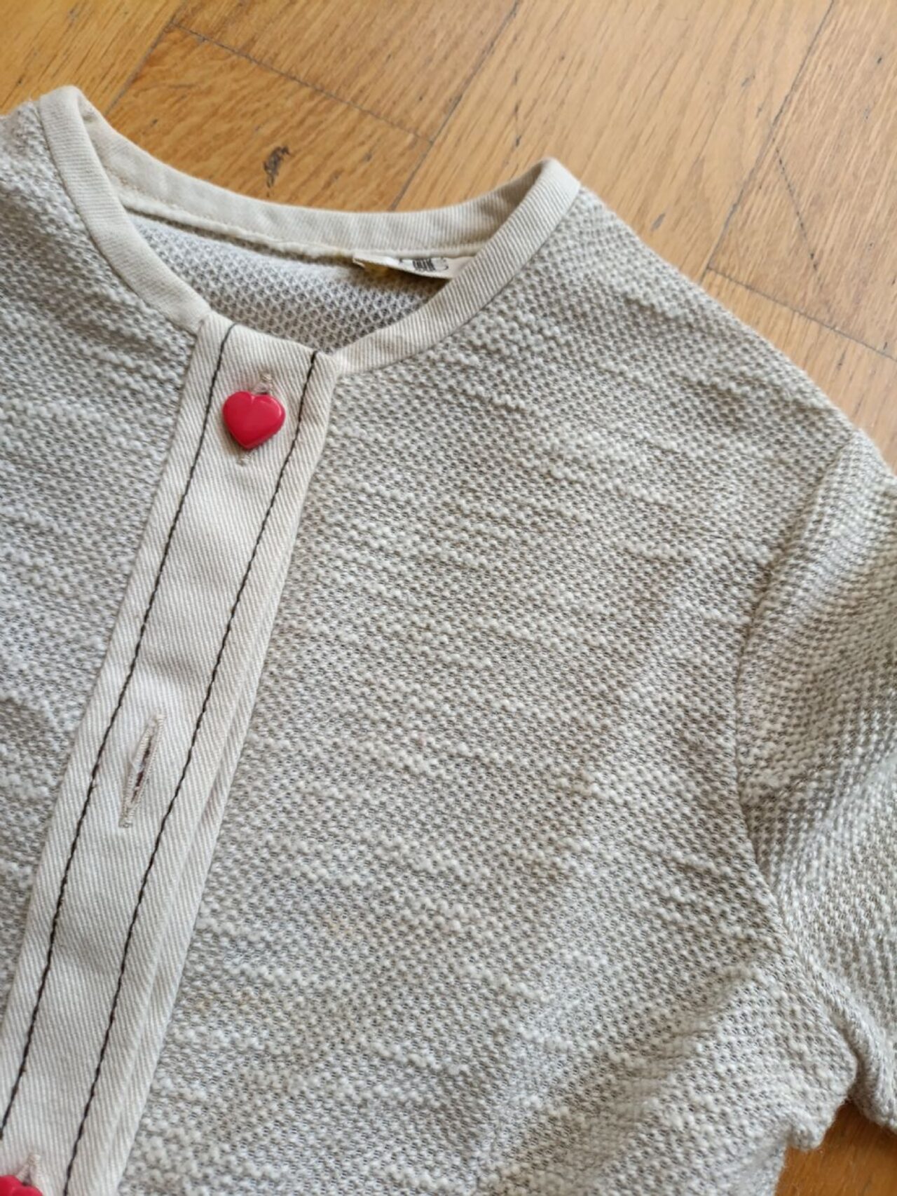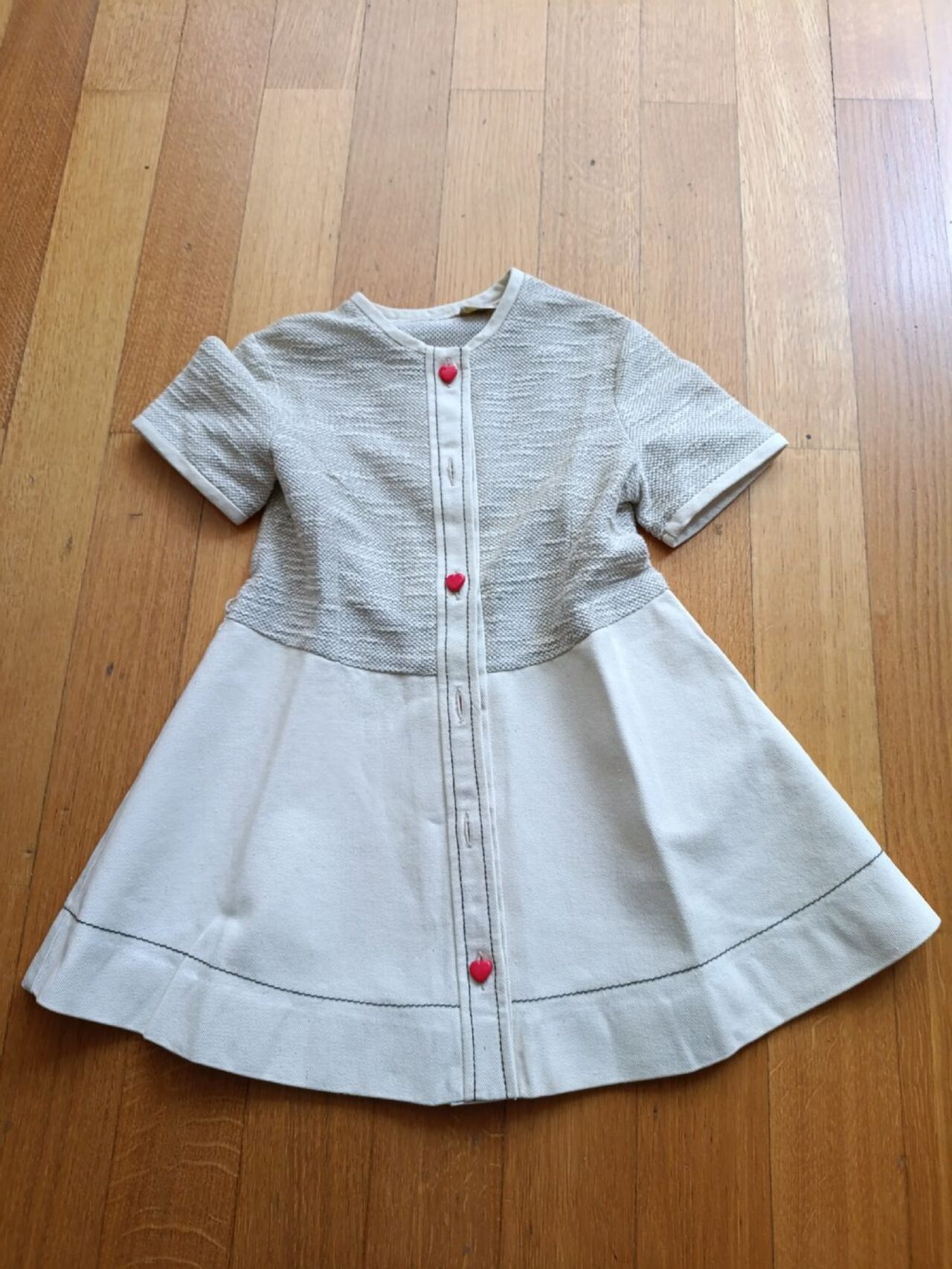 Vestito vintage per bimba 4 anni circa (ascelle 30, lunghezza 50 cm) con deliziosi bottoncini a forma di cuore e gonna ampia. Non c''è etichetta ma la gonna è in cotone molto robusto, la parte superiore è anch''essa in cotone con lavorazione tipo maglina. C''è anche la cintura che ha qualche minima imperfezione, ma può tranquillamente essere indossato senza. .