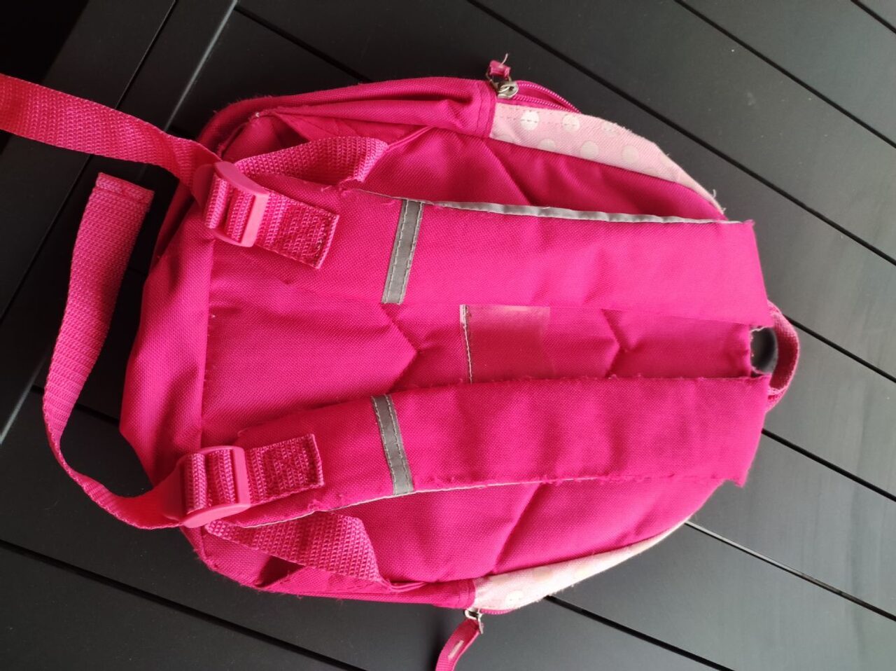 Zainetto asilo di Minnie, ha un taglio davanti visibile in foto e il rivestimento interno è spellato, ma da fuori non si vede. Per il resto in buono stato. Mia figlia lo adorava .