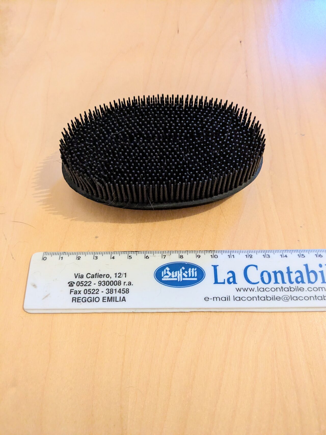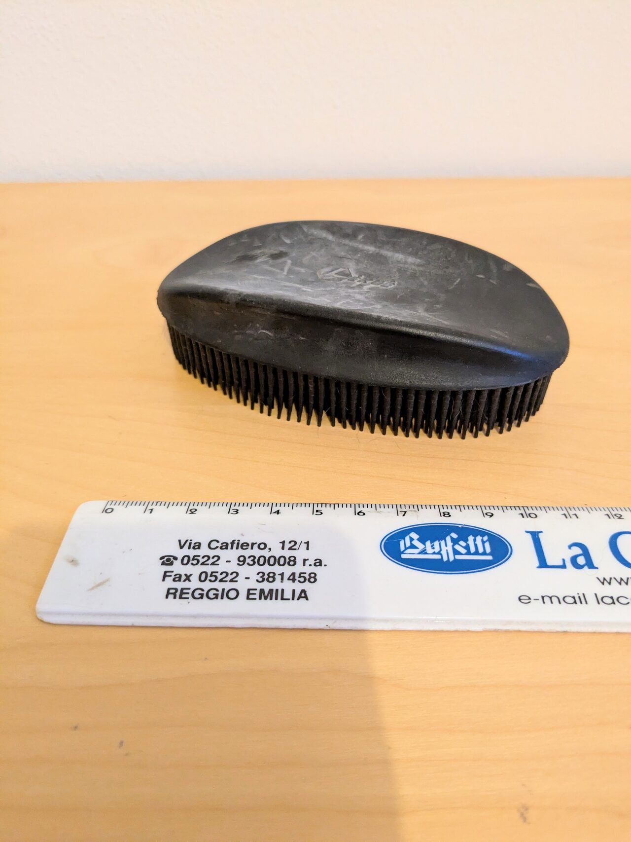 Spazzola con setole in gomma, molto morbida. Io la usavo per distribuire prodotti sul pelo dopo il bagnetto, non è adatta per togliere il pelo (come quelle che si usano per i gatti) nè per districarlo. .