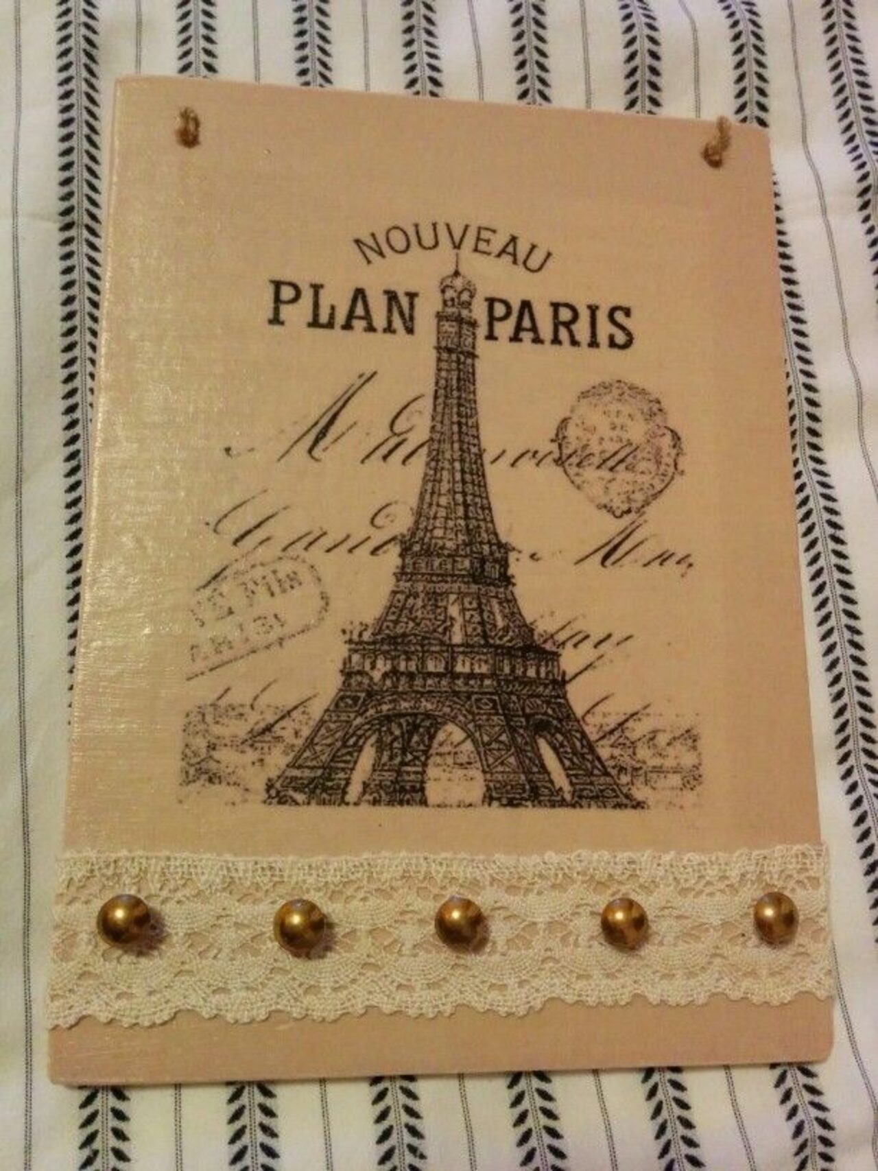 Un avanzo di compensato, una stampa vintage applicata con la tecnica del decoupage, un po'' di spago, un ritaglio di pizzo e qualche gancetto o molletta, ecco come materiali poveri di recupero possono trasformarsi in oggetti utili. .