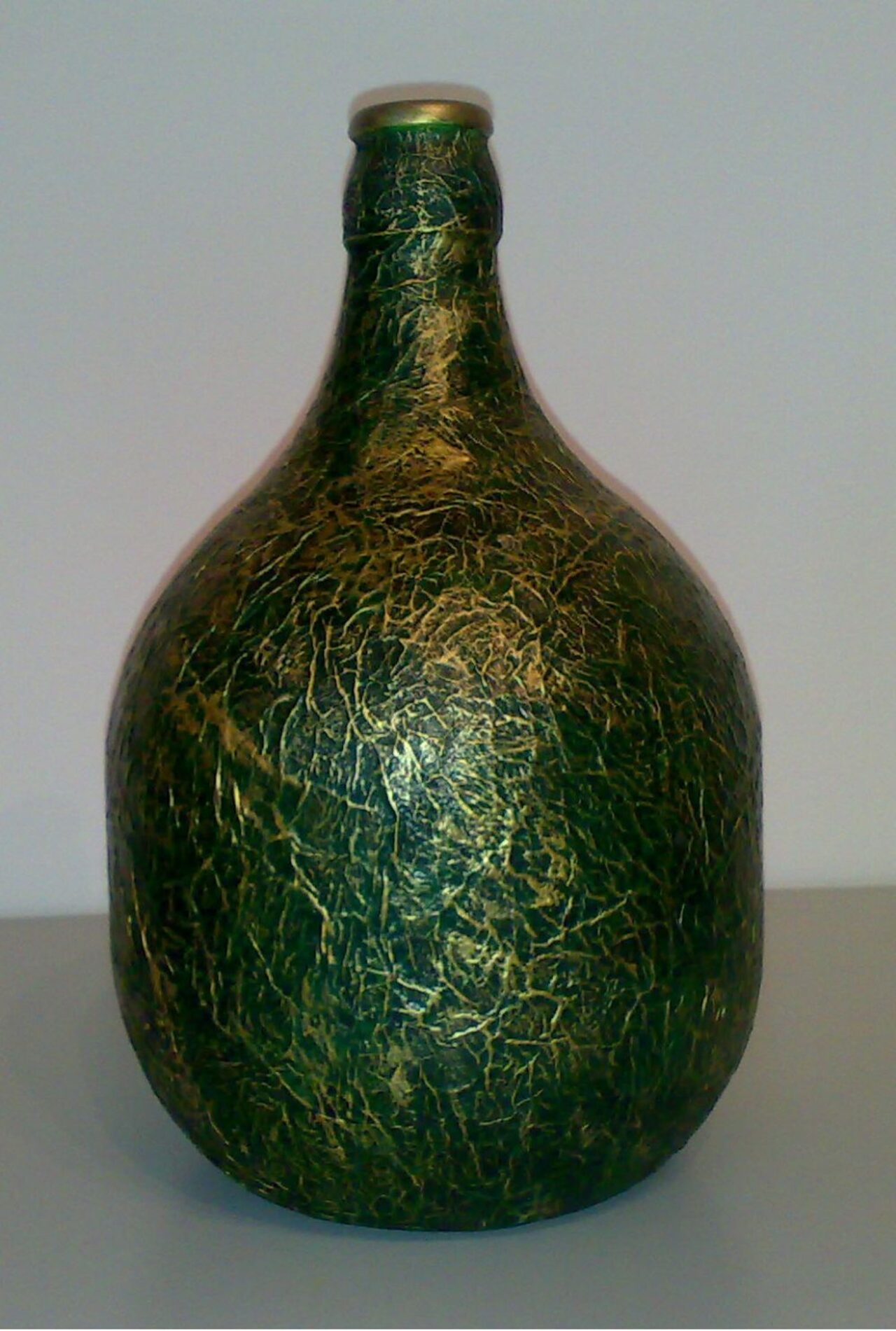 Occorrente: boccioni di vetro puliti, colla vinilica diluita con acqua, tovagliolini carta colorati, colore acrilico oro antico, pennello a punta piatta. .