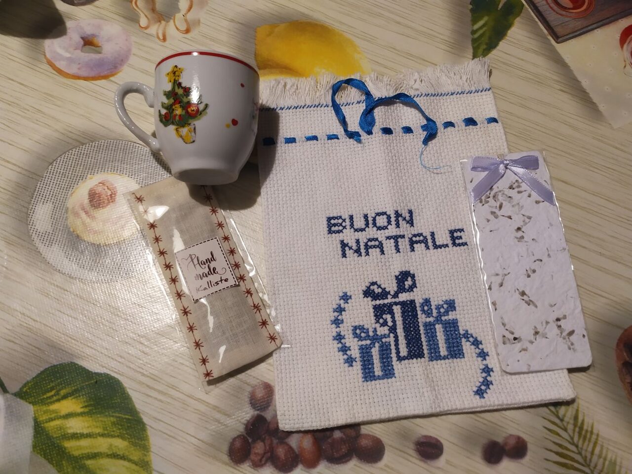 Ho 4 amiche qui a Parma che ho conosciuto tramite un sito dedicato alla lettura, e dopo ormai parecchi anni siamo molto legate. Ogni Natale ci scambiamo un pensiero e il mio lo fornisce coseinutili! Quest''anno: tazzine di Anto1096, segnalibro e sacchettino profumato di Kalliste, chiudipacco di Pictures of me, e i sacchettini ricamati non mi ricordo da chi li ho presi ma arrivano anche loro dal sito! .