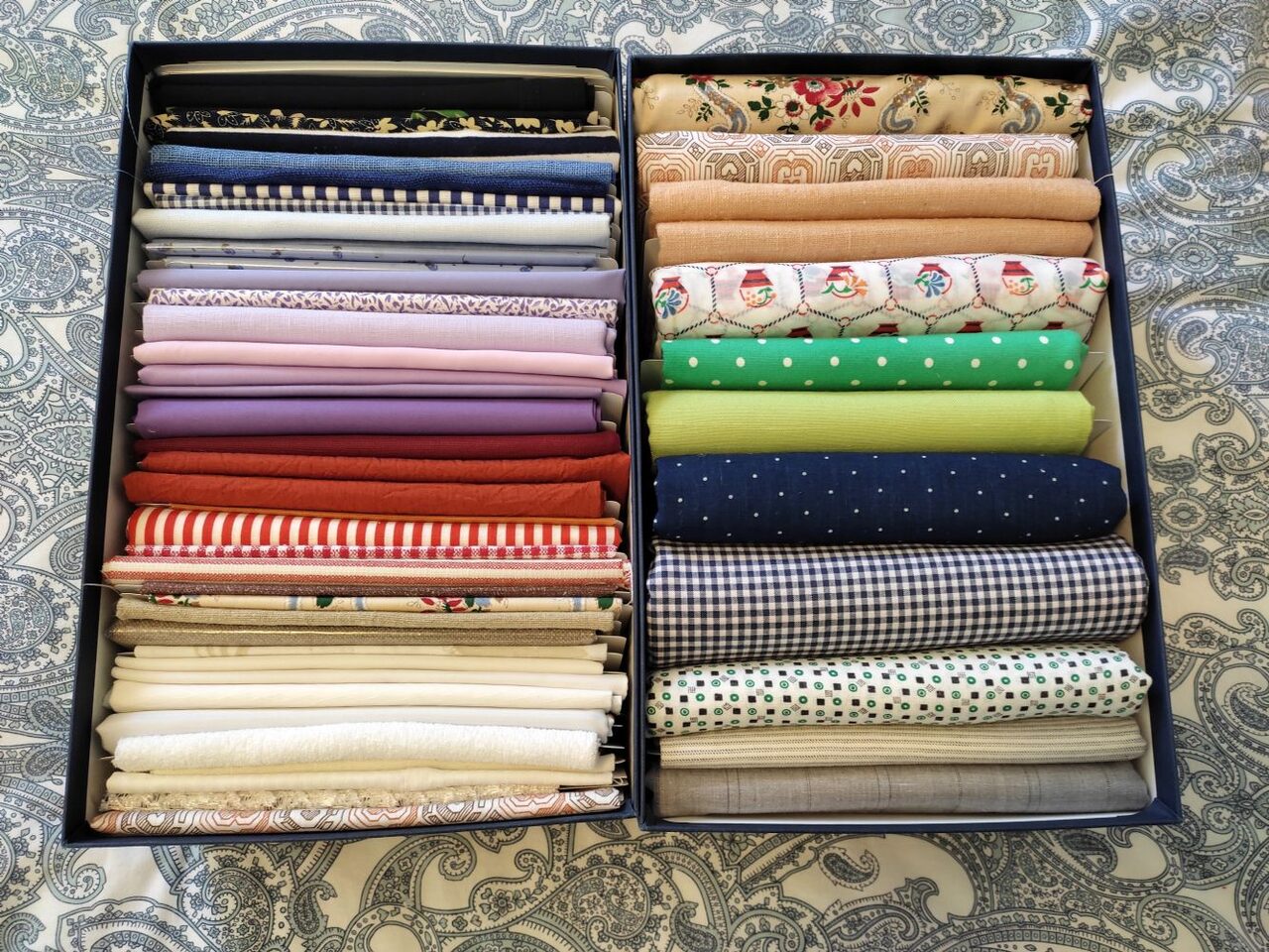 È un''idea che nasce dalla necessità di avere sott''occhio colori e fantasie delle amate stoffine che uso per i miei lavoretti di cucito, senza dover rovistare ogni volta nelle scatole per cercare quella che mi serve.Facile da realizzare, basta ritagliare dei cartoncini a misura della scatola, avvolgere le stoffe e posizionarle in verticale.Io ho utilizzato dei fogli di plastica rigida che avevo in casa, ma va benissimo qualsiasi cartoncino rigido, anche di recupero.Ho applicato delle etichette sulle scatole per individuare il contenuto quando sono chiuse col coperchio. .
