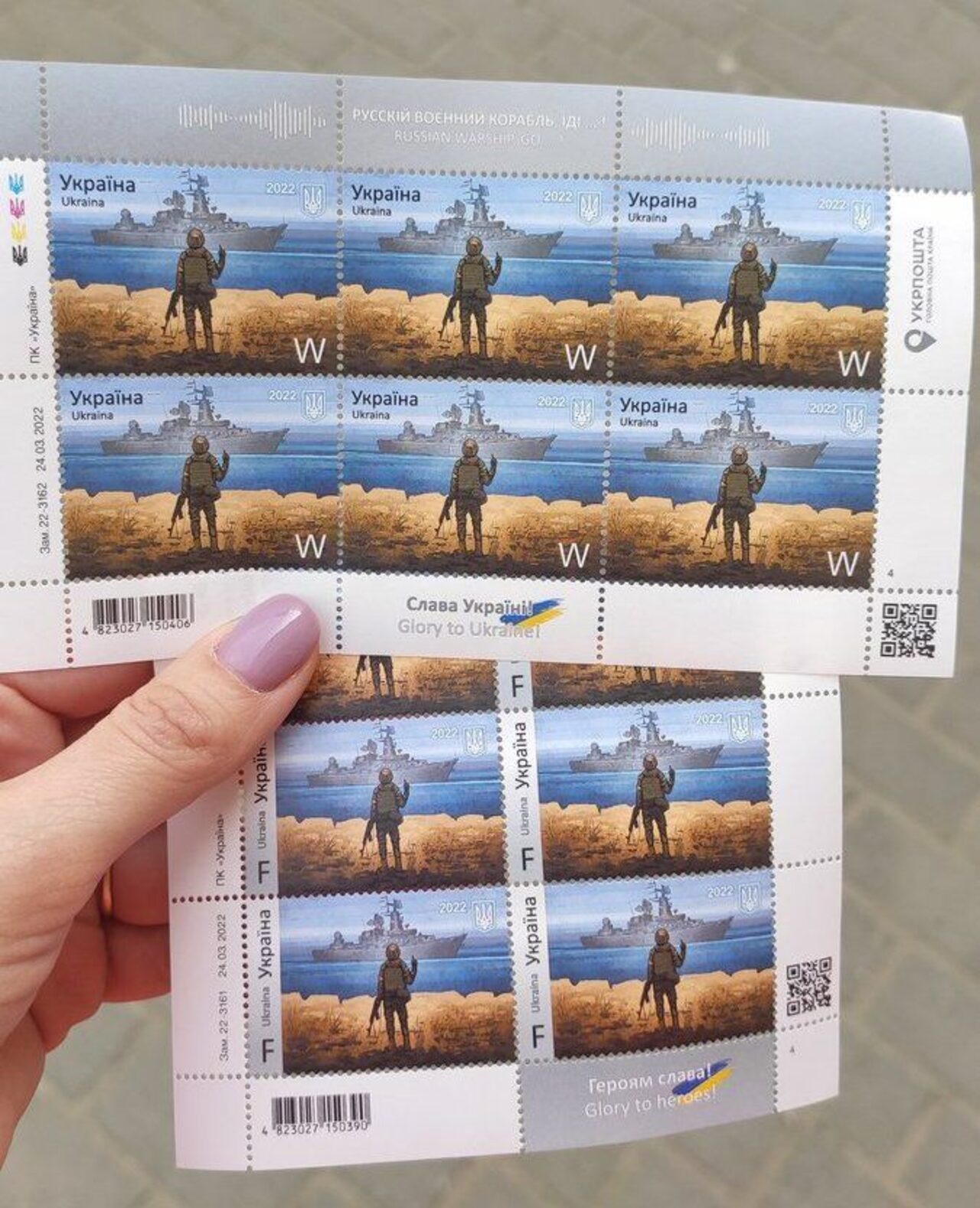 Cerco questo francobollo emesso in Ucraina in aprile 2022.Nel francobollo c’è un soldato ucraino sull’isola dei Serpenti che mostra il dito medio all’incrociatore russo “Moskva”.Sono disponibili in due versioni: una più piccola (foto 1) e una più grande (foto 2). Ovviamente anche tutti e due non mi dispiacerebbero. Grazie a tutti.Ciao. .