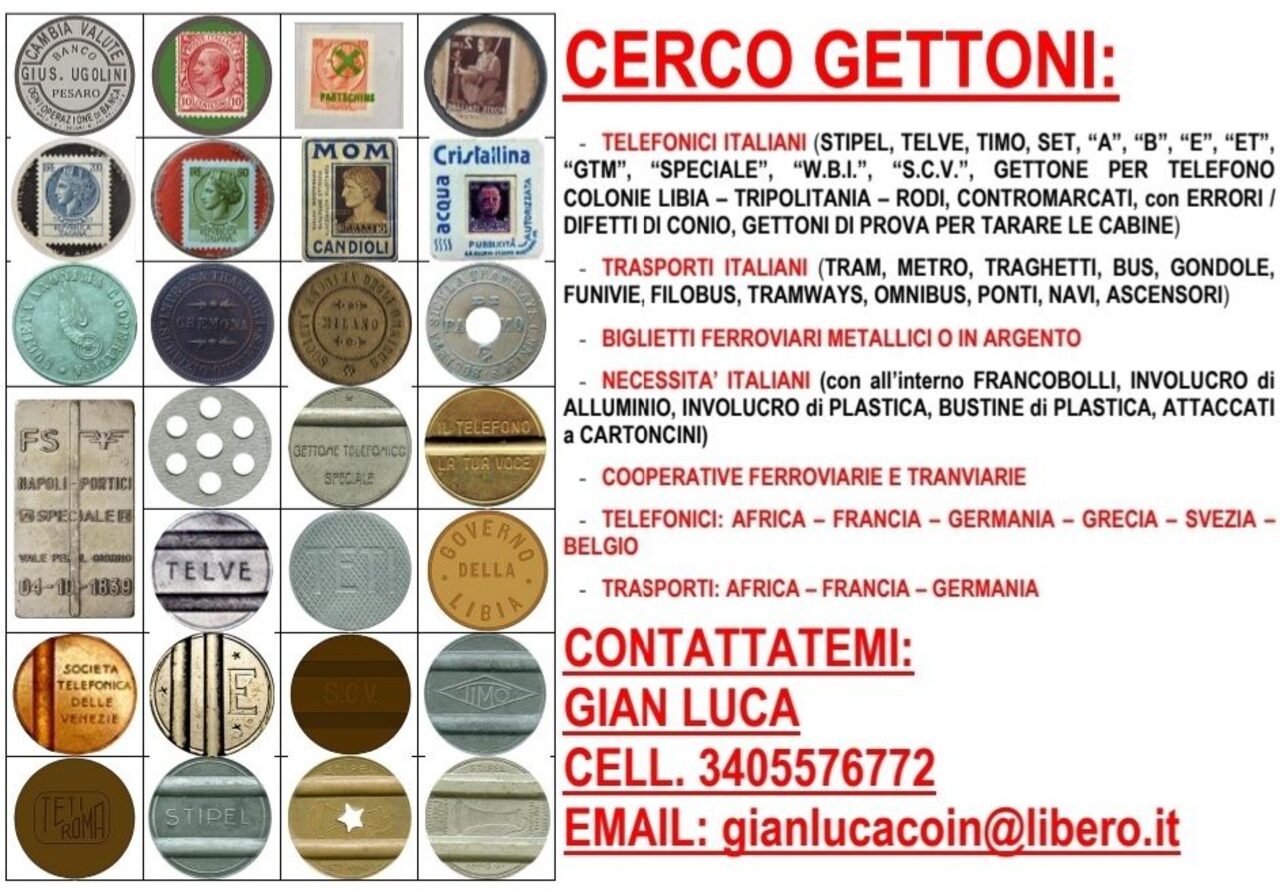Cerco GETTONI di varie tipologie: GETTONI TELEFONICI , GETTONI DI TRASPORTO , GETTONI DI NECESSITÀ CON FRANCOBOLLI INCAPSULATI.Non esitate a contattarmi al 3405576772 .