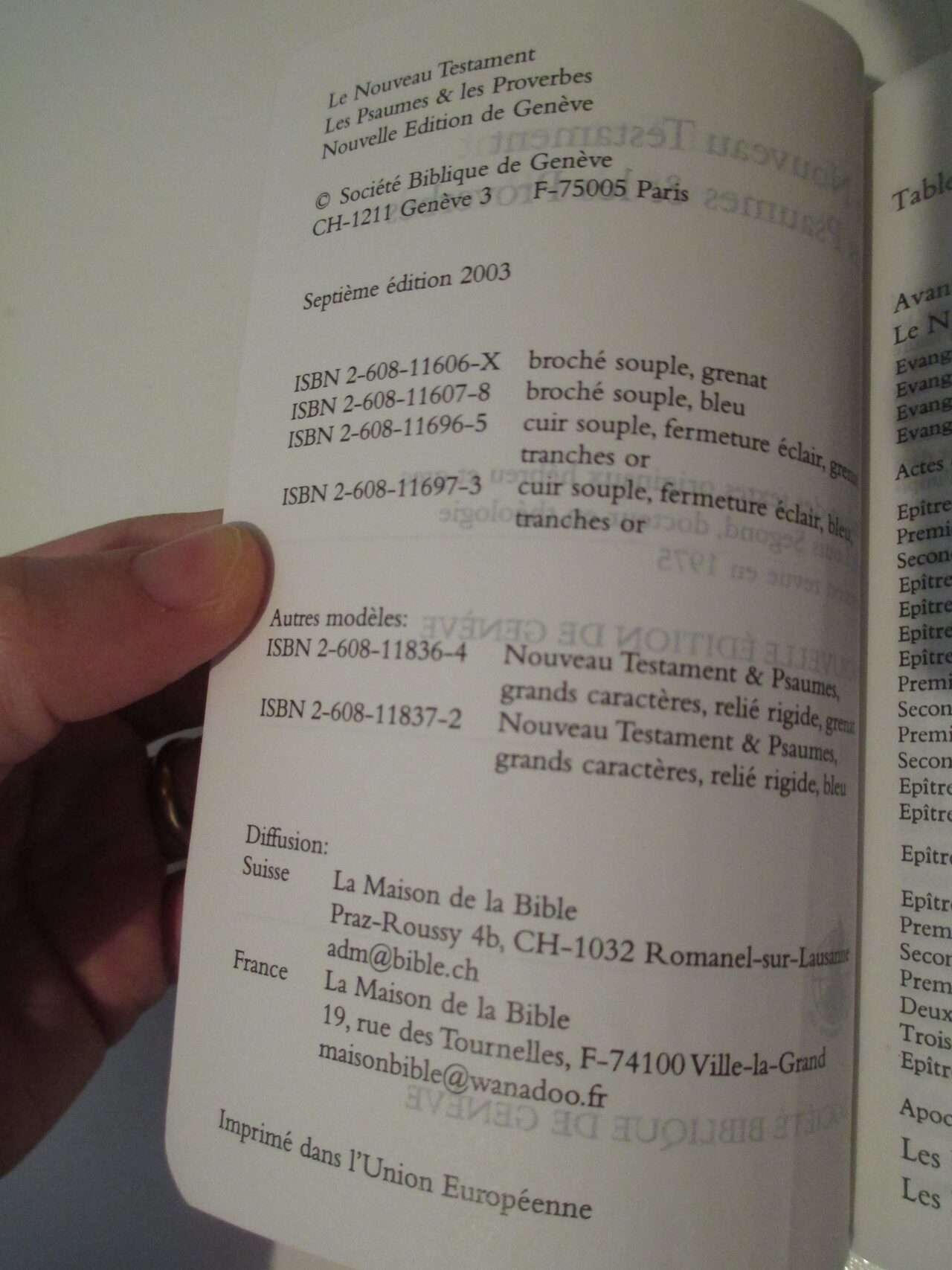 Nuovo testamento con proverbi e salmi in francese.