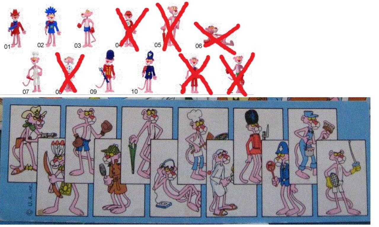 continua la ricerca delle sorpresine e cartine mancanti...foto 1: looney tunes active (mancano le cartine)foto 2: supergiraffe (manca davanti moto della 3 e piedistallo della 8)foto 3: puffi 1989 (mancano i personaggi in foto più i pezzi cerchiati più la cartina)foto 4: puffi 1996 (mancano i personaggi in foto più i pezzi cerchiati più la seconda cartina)foto 5: paperino e i suoi amici ( mancano i personaggi in foto più i pezzi cerchiati più le cartine)foto 6: pantera rosa 1989 (mancano i personaggi in foto, più la coda del n.5 più cartina) .