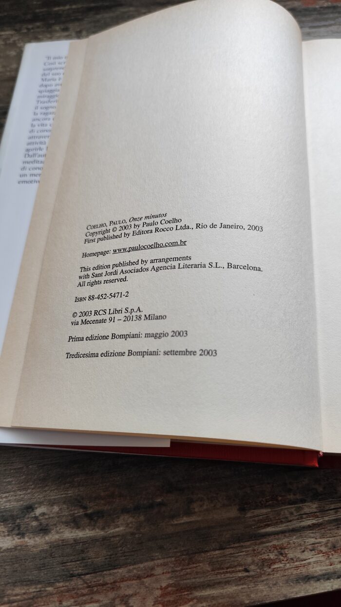 Libro “Undici minuti” di Paulo Coelho, edizione Bompiani 2003, copertina rigida con sovra copertina, ottime condizioni, pagine un po’ ingiallite dal tempo.