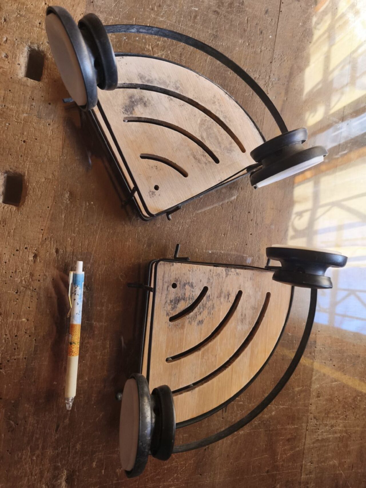 In metallo e bambù, con ventose per non bucare le piastrelle. Una parte dei ripiani in bambù è diventata scura. .