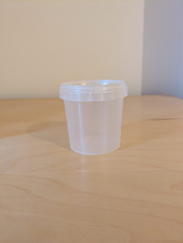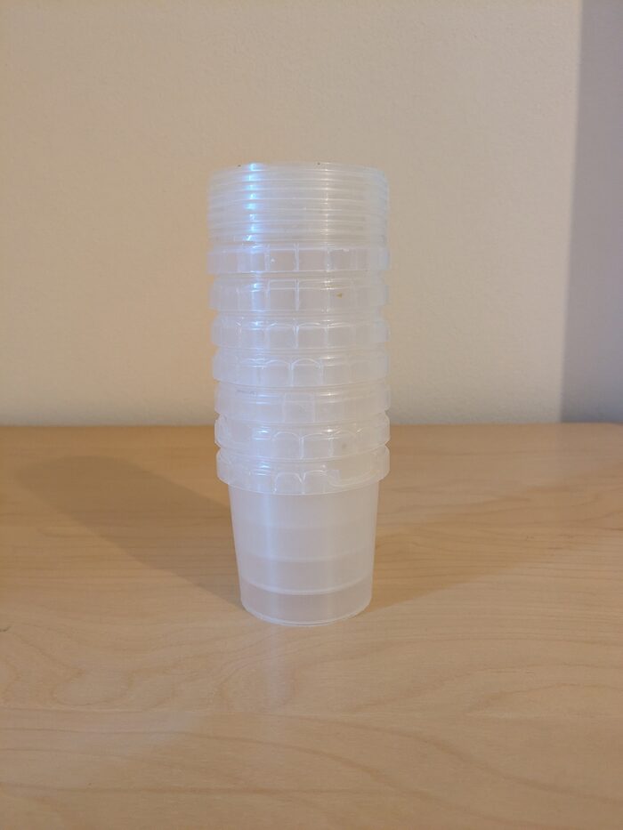 7 barattoli di plastica uso alimentare recuperati e lavati con chiusura ermetica. Diametro alla base cm 5,5 - altezza cm 6,5.