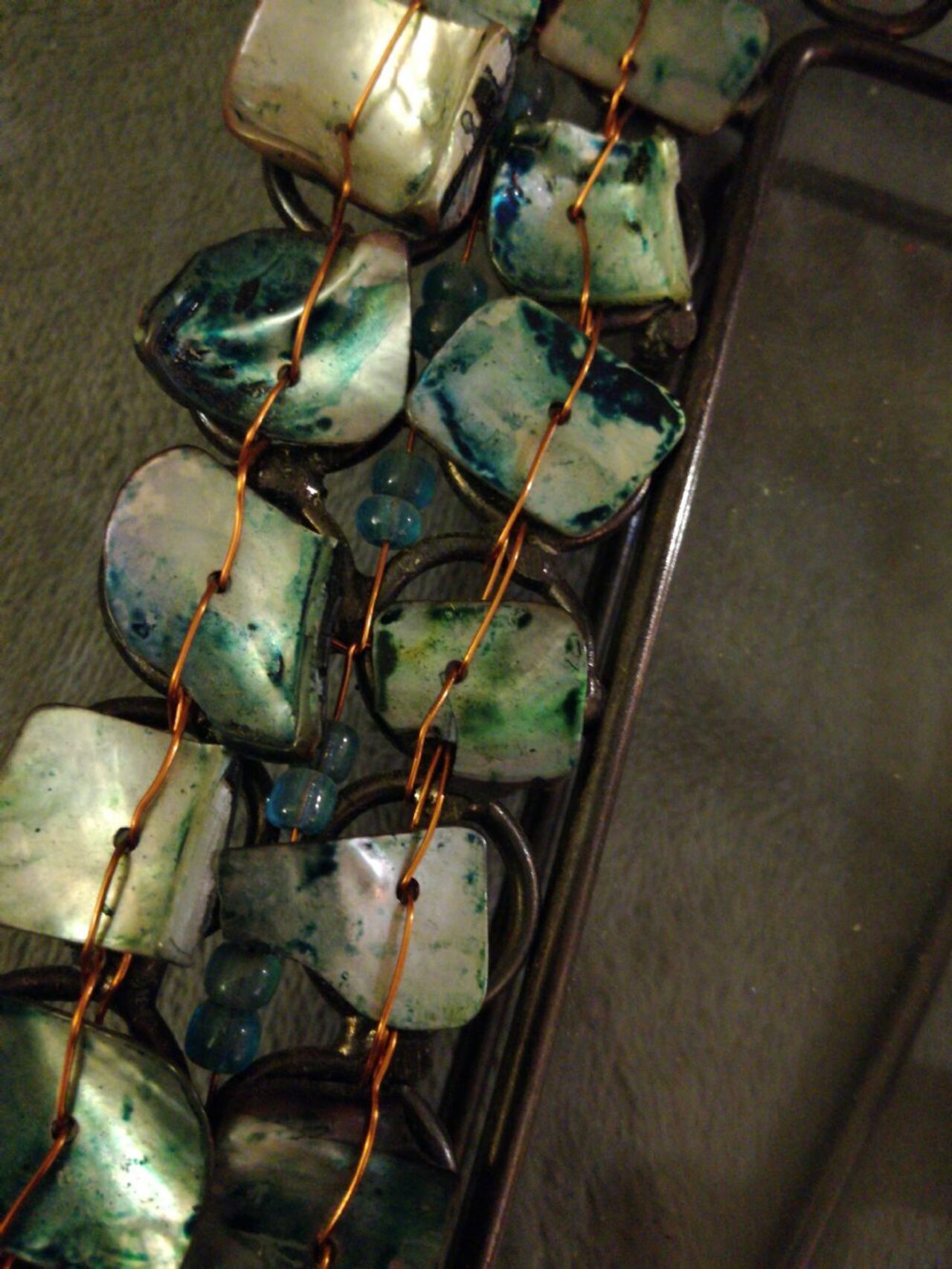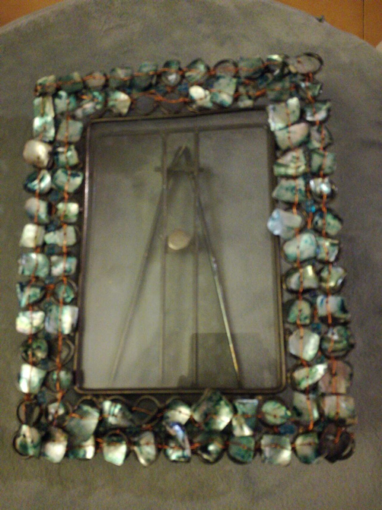 Portaritratto in metallo, madreperla, filo di rame, con vetro si può sia appendere che d''appoggio Misure cm.17x21 esterno Cm 10x14,5 interno